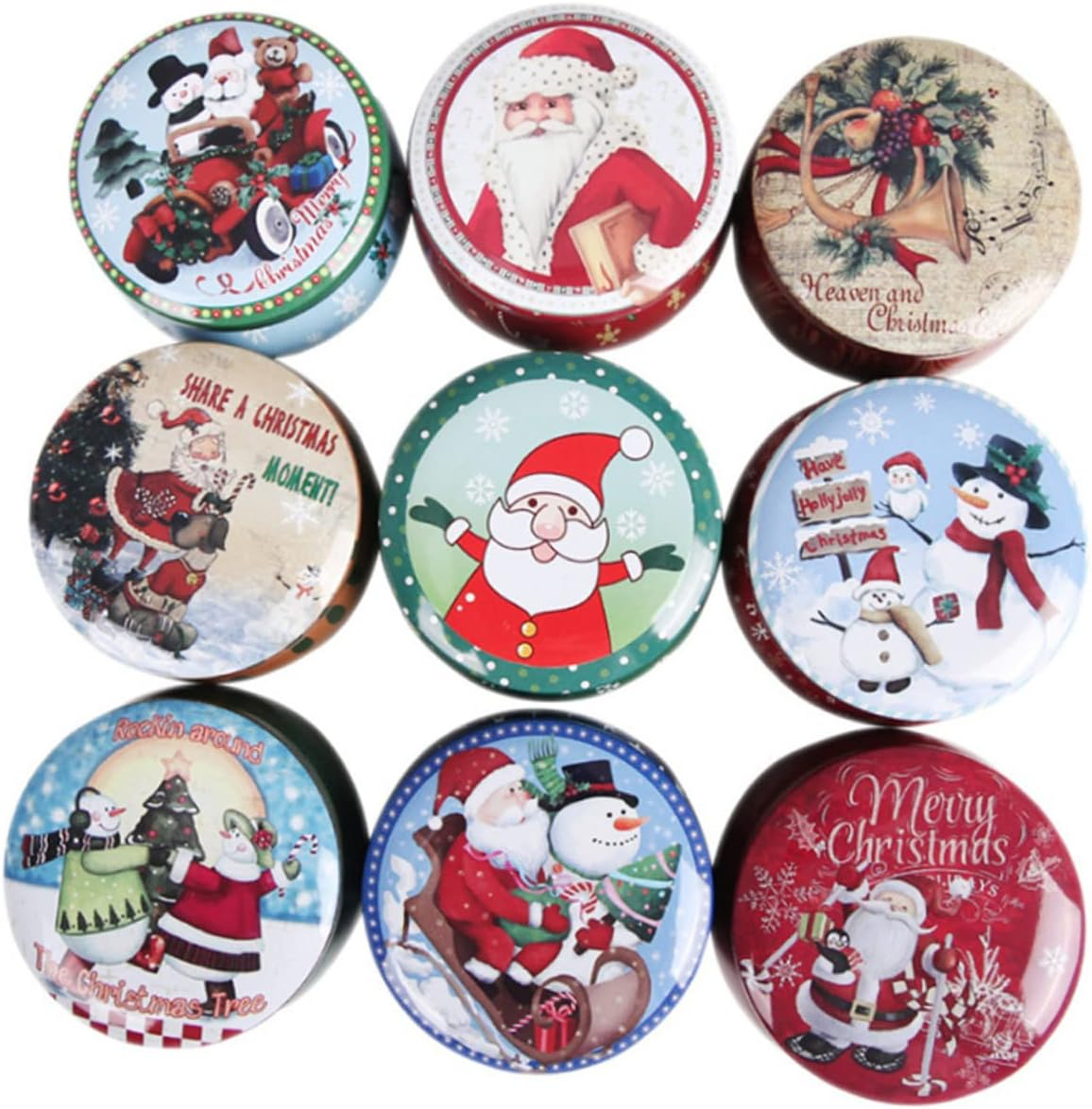 Această cutie metalică rotundă, cu design vesel de Crăciun, este perfectă pentru a oferi cadouri într-un mod special.