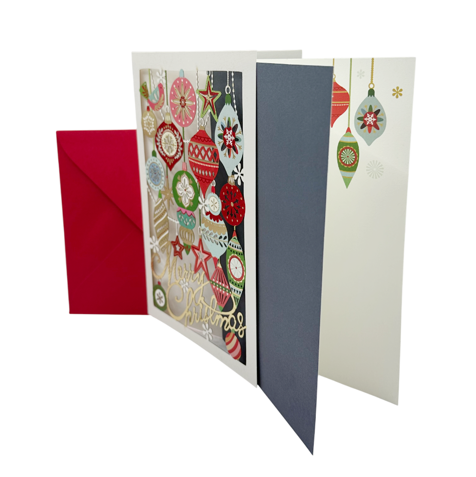 Adaugă un strop de bucurie și culoare sărbătorilor cu această felicitare „Merry Christmas”, decorată cu globuri festive și motive tradiționale de Crăciun. Designul vibrant, în nuanțe de roșu, verde, auriu și albastru, este completat de plicul roșu intens – perfect pentru a însoți un cadou sau pentru a transmite un mesaj cald celor dragi.