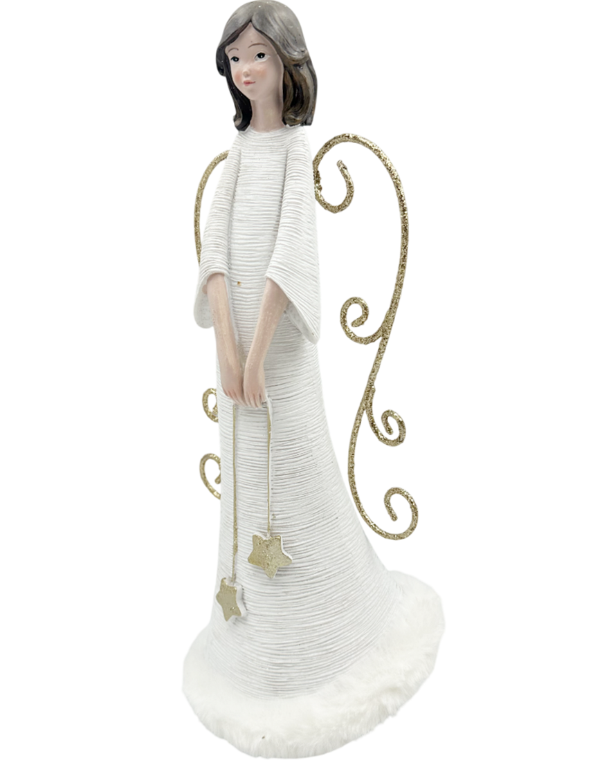 Un îngeraș delicat în rochie alba cu blanita, cu aripi aurii și două stele sclipitoare.