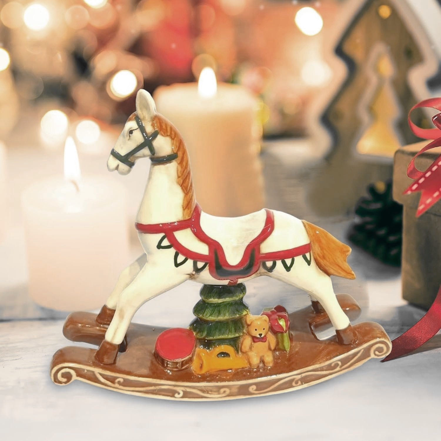 Această figurină decorativă în formă de căluț balansoar aduce un aer nostalgic și elegant oricărui decor de iarnă. Realizată cu atenție la detalii, piesa îl înfățișează pe căluțul alb împodobit cu șa roșie, balansându-se deasupra unui mic brăduț, alături de un ursuleț și cadouri colorate.