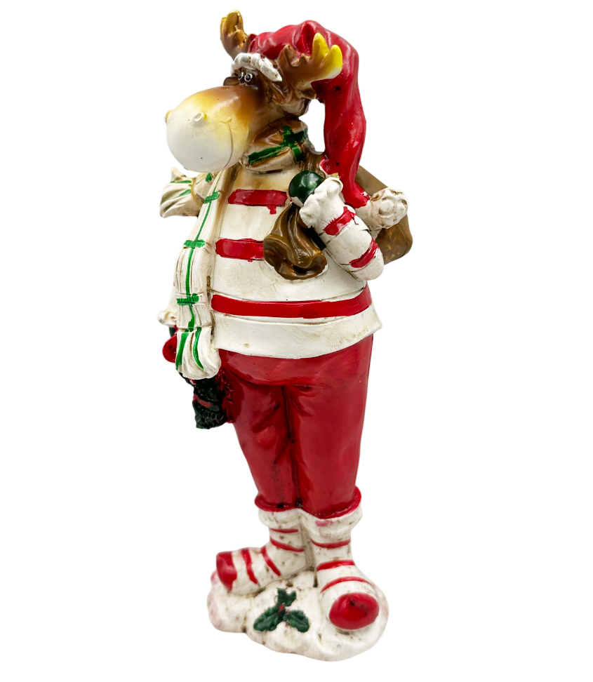 O figurină veselă în formă de ren de Crăciun, îmbrăcat în haine roșii și alb-crem, cu eșarfă și căciulă festivă. Ține în mână o coroniță și are un aer jucăuș, perfect pentru a aduce un strop de culoare și voie bună în decorul de sărbători.