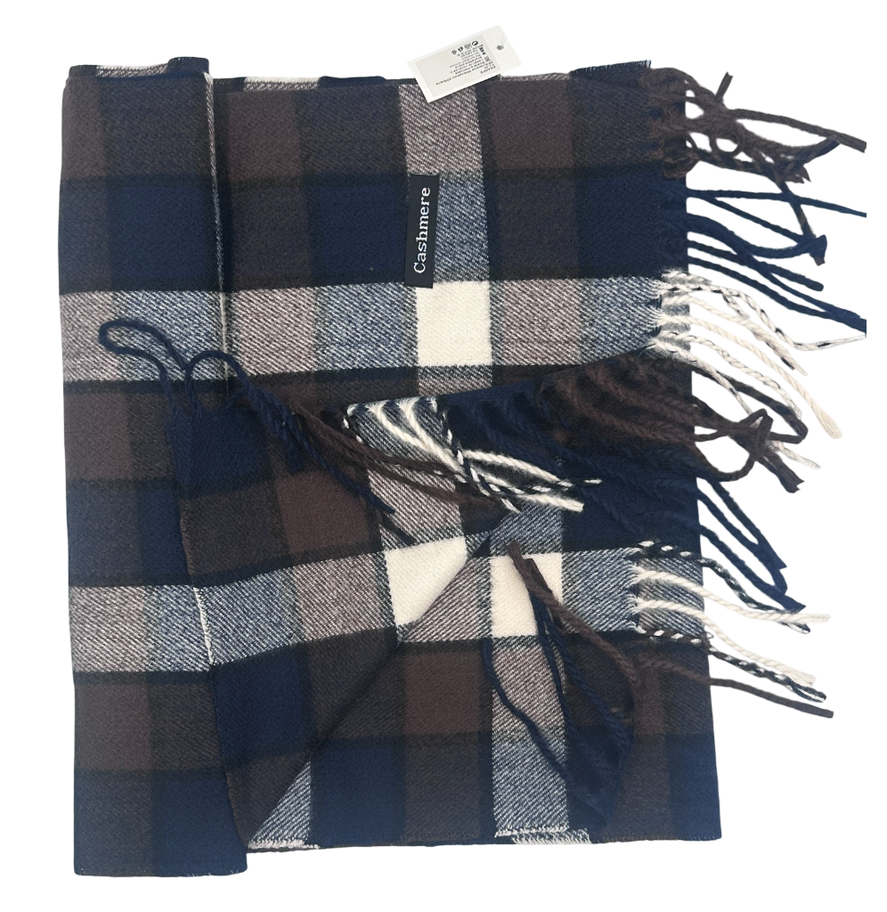Eșarfă elegantă, cu model clasic în carouri maro, alb si bleumarin, ușor de asortat atât la ținute casual, cât și la cele smart-casual. Materialul moale și plăcut la atingere oferă confort termic în sezonul rece, iar franjurii discreți completează designul într-o notă rafinată.