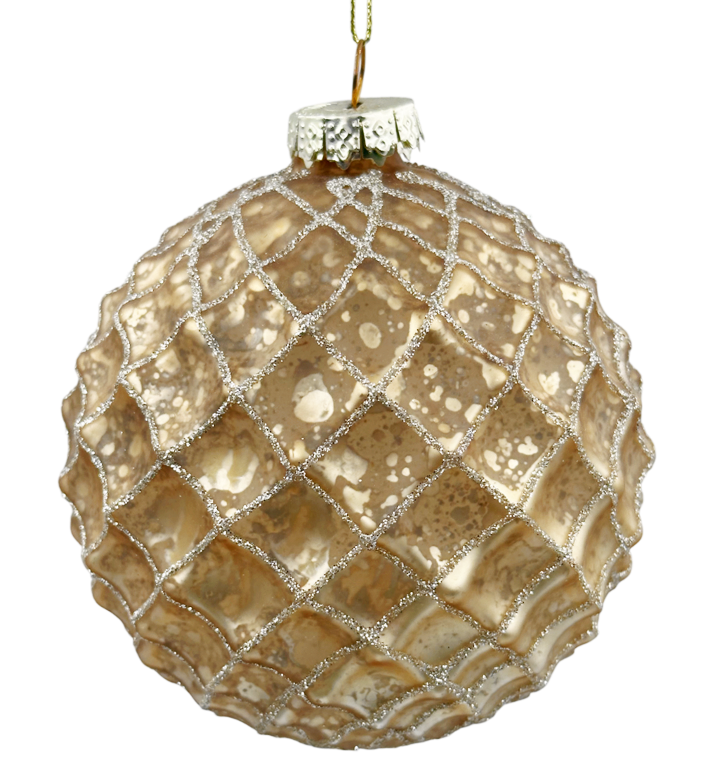 Glob delicat din sticlă auriu-bej, cu finisaj lucios și decorat manual cu sclipici argintiu.