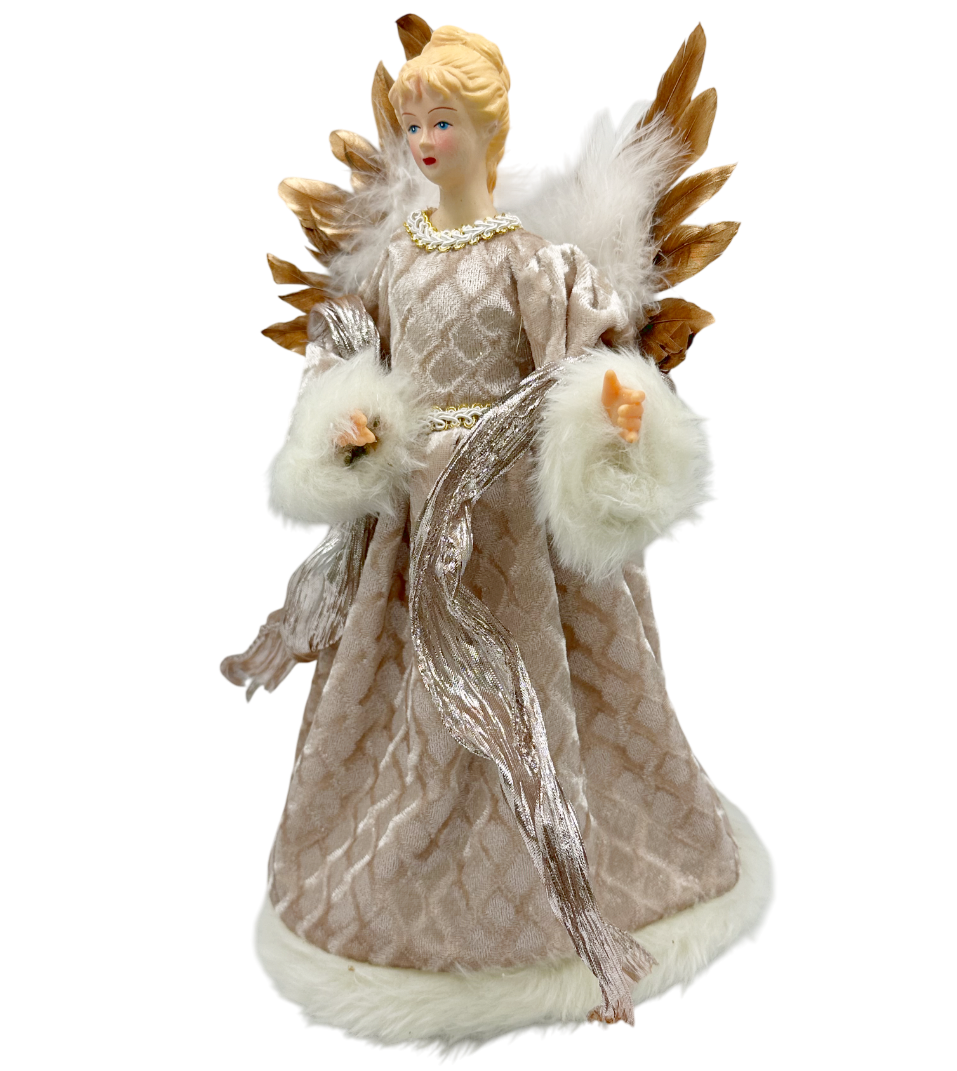 Înger decorativ sampanie cu aripi albe și rochie din catifea si blanita – figurină de Crăciun elegantă