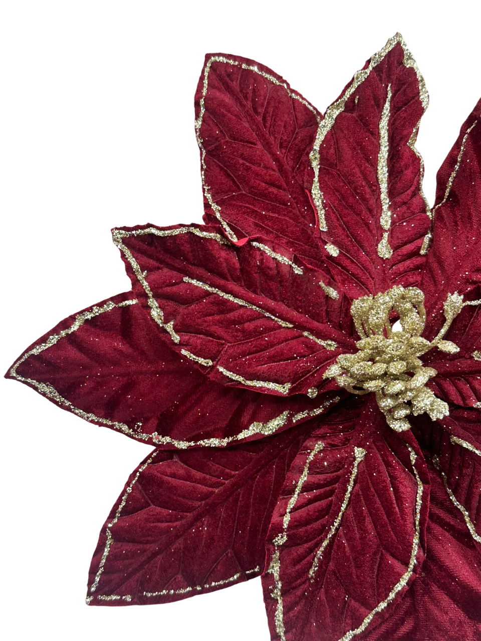 Adaugă o notă de eleganță clasică decorului tău de sărbători cu această floare decorativă bordo cu margini aurii, inspirată de floarea Crăciunului (poinsettia). Petalele catifelate în nuanță intensă de roșu sunt conturate delicat cu sclipici auriu, oferind un contrast rafinat și festiv.