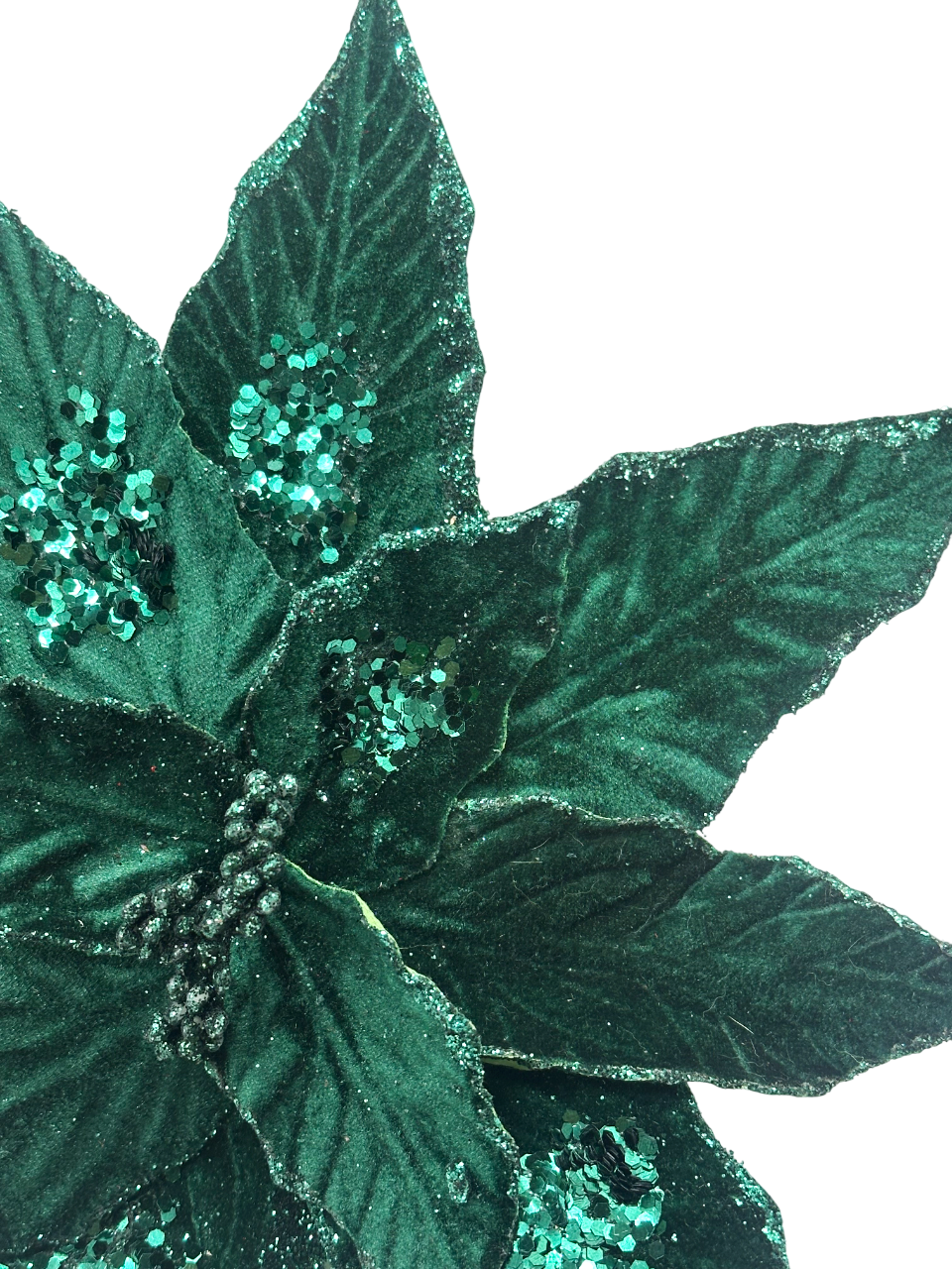 Floare decorativă verde intens, inspirată de floarea Crăciunului (poinsettia), cu petale catifelate și accente strălucitoare de sclipici și paiete – un ornament festiv deosebit de elegant.