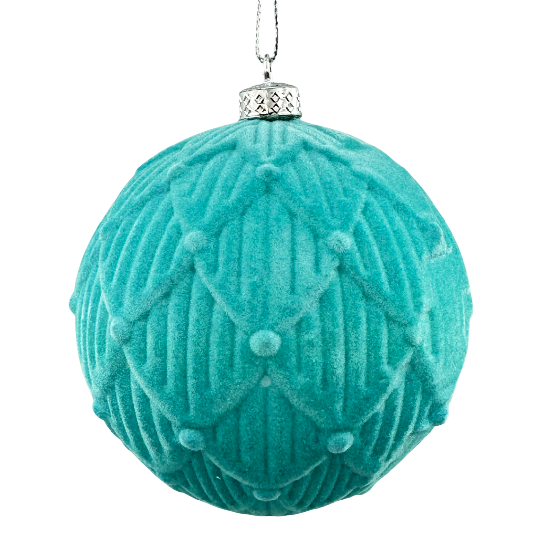 Ornament pentru brad sau aranjamente decorative de iarna Globul decorat cu romburi - JUANITO - are o textura catifelata si poate fi utilizat atât într-un decor clasic, cât și într-unul modern, pentru a adăuga accente festive.