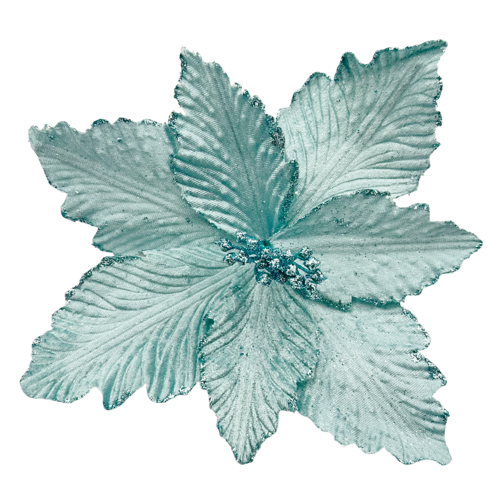 Decoratiune pentru brad sau aranjamente decorative de iarna Craciunita bleu perlat CAROL - din material textil - poate fi utilizată atât într-un decor clasic, cât și într-unul modern, pentru a adăuga accente festive.