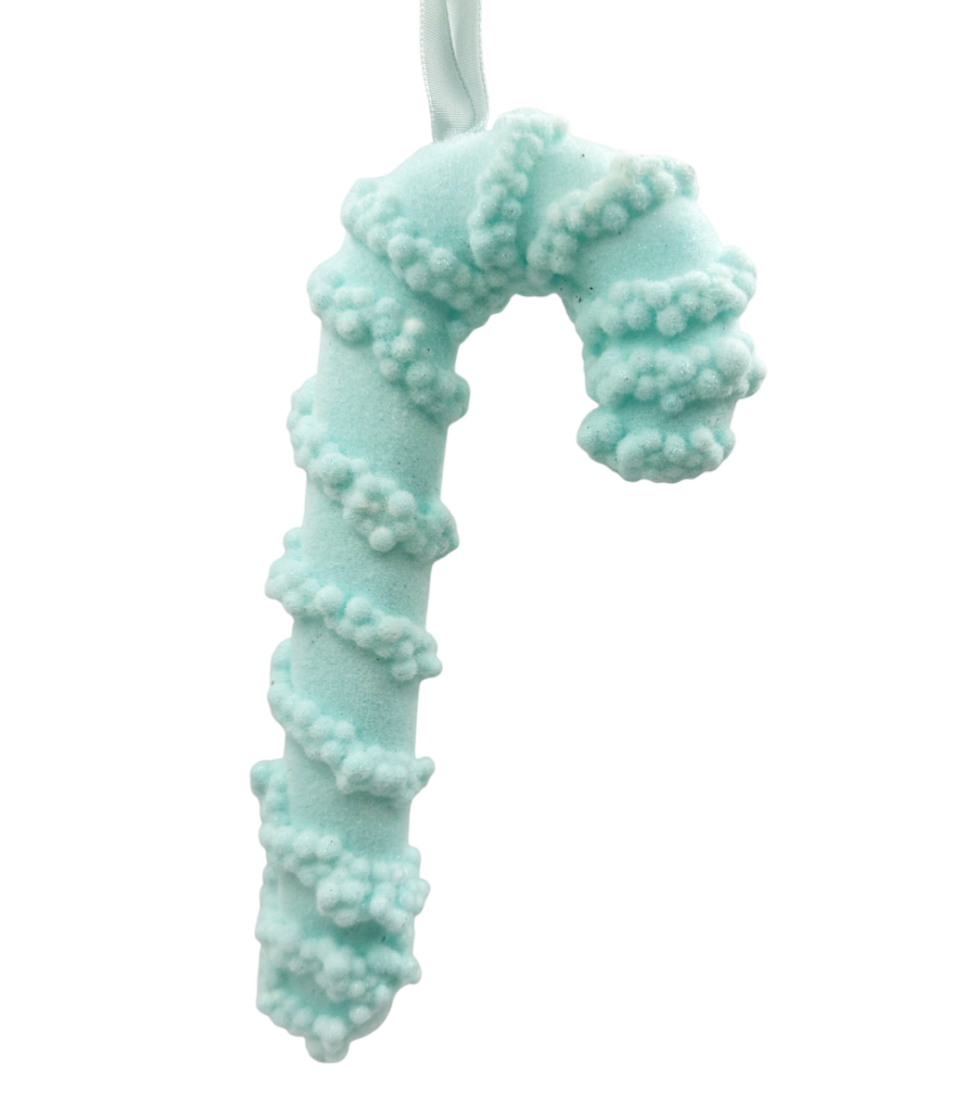 Bastonașul - acadea bleu turcoaz catifelat, decorat cu detalii fine și textură pufoasă, este perfect pentru un brad jucăuș și modern. Nuanța pastelată aduce un strop de prospețime și veselie, iar forma sa clasică inspiră spiritul autentic al Crăciunului. Se potrivește minunat cu alte decorațiuni pastelate sau în tematici dulci de iarnă.
