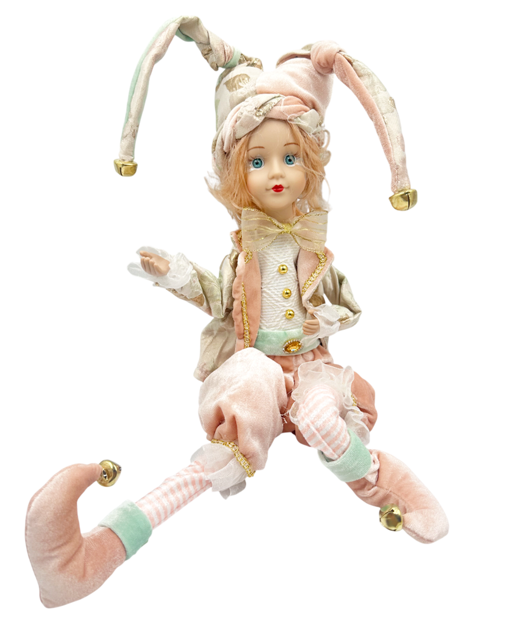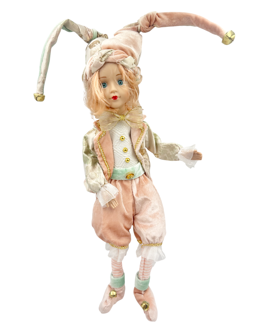 Păpușă decorativă Arlechin cu detalii rafinate în nuanțe de roz pastel, auriu și verde menta.