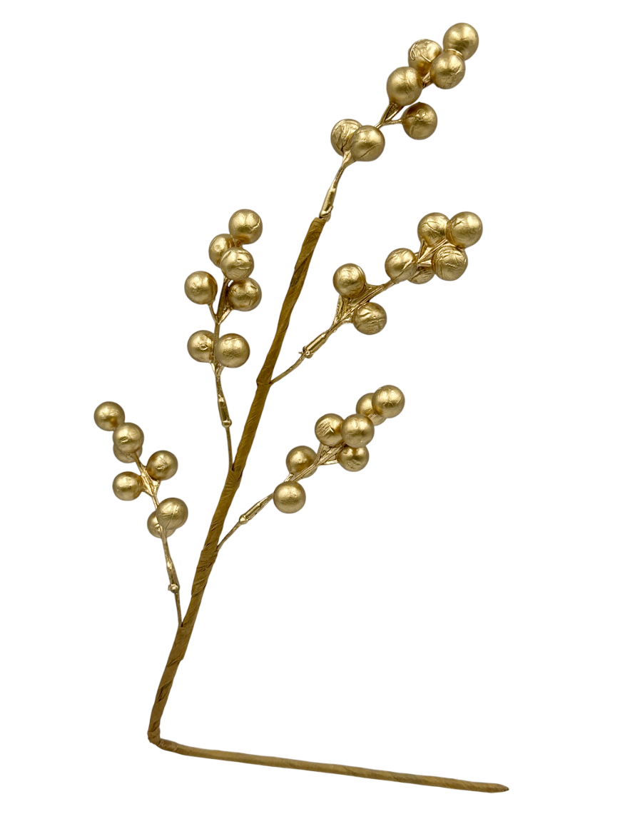 Ramură decorativă elegantă, cu bobițe aurii lucioase tip „Pearl Berry”, ideală pentru aranjamente florale, decoruri de Crăciun, coronițe sau vaze ornamentale.
