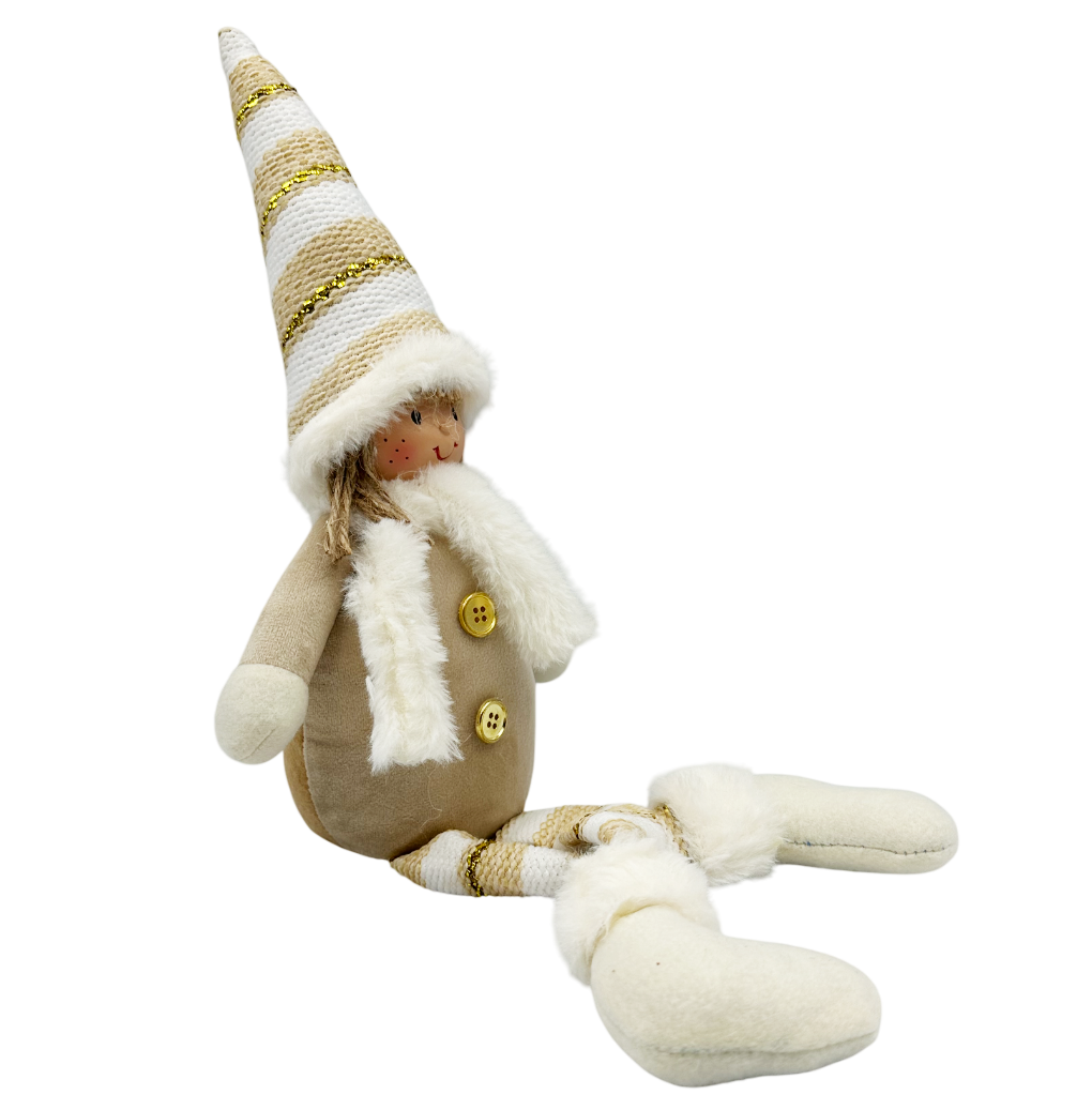 Această figurină decorativă în nuanțe calde de bej și auriu aduce o notă elegantă și luminoasă decorului tău de sărbători. Cu o pălărie tricotată în dungi aurii, fular pufos și zâmbet vesel, este perfectă pentru a completa atmosfera festivă din casă.
