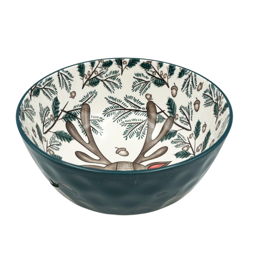 Adaugă un strop de eleganță și veselie mesei de Crăciun cu acest bol ceramic decorat cu un ren stilizat și motive naturale de iarnă. Cu design atent pictat în nuanțe calde de bej, verde și roșu, bolul creează o atmosferă cozy și rafinată.