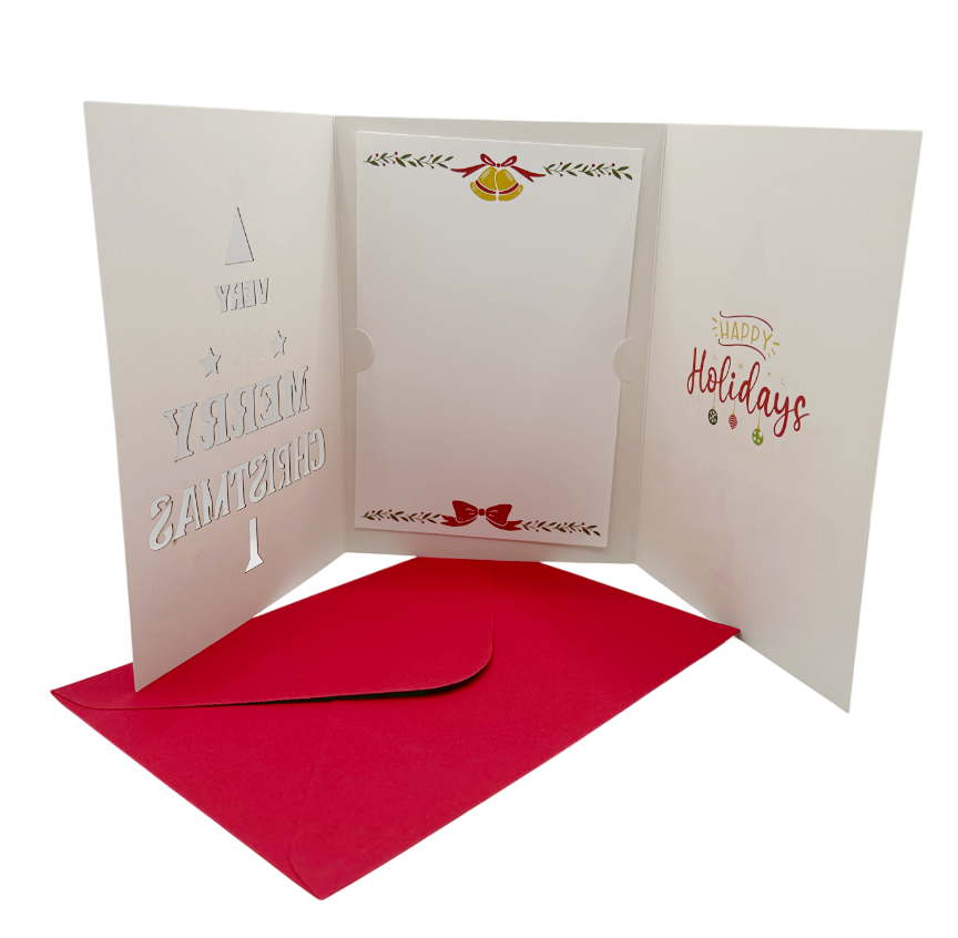 Felicitarea „ Merry Christmas” este realizată pe carton alb de calitate, decorată cu accente aurii și litere colorate dispuse sub formă de motive de Crăciun. Plicul roșu intens completează perfect designul festiv, adăugând o notă de eleganță și bucurie.