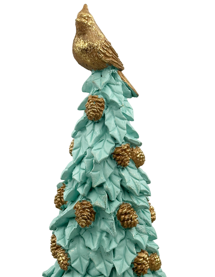 Realizat în nuanțe elegante de turcoaz, împodobit cu conuri aurii si pasarea Craciunului aurie, bradul are un design rafinat, inspirat din tradițiile festive.