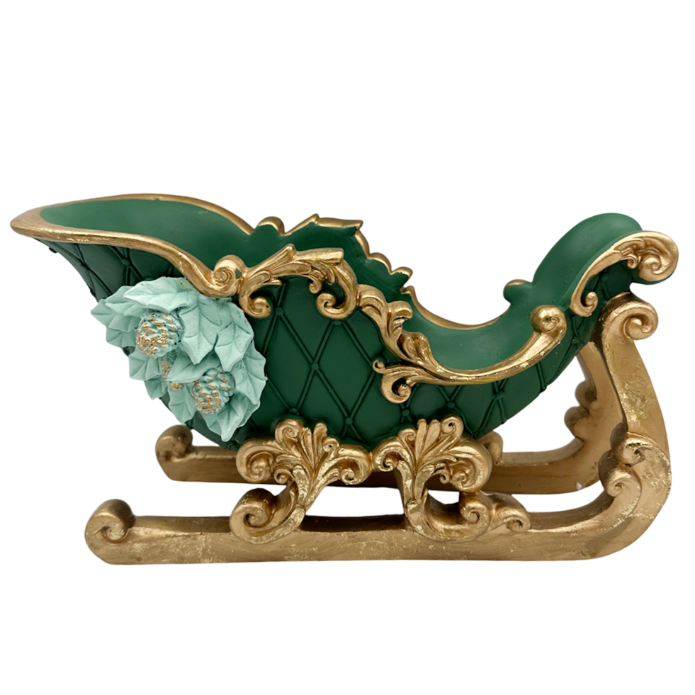 Adaugă un strop de eleganță festivă în decorul tău de sărbători cu această superbă figurina decorativă Sanie Regala cu elemente aurii. Cu un design rafinat, în nuanțe bogate de turcoaz, verde și auriu, piesa reprezintă o sanie stilizata, eleganta, cu detalii atent lucrate.