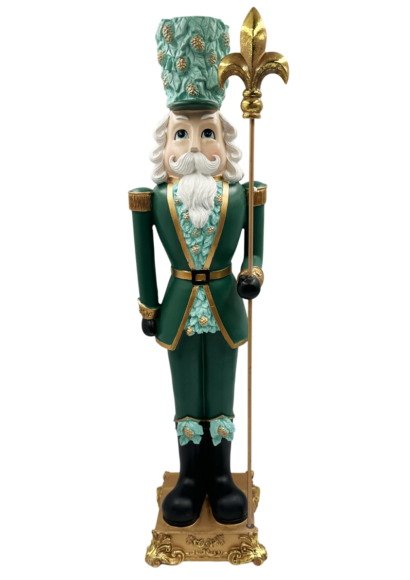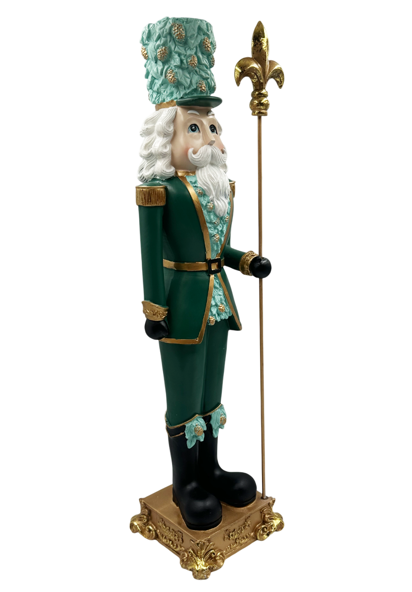 Această figurină impresionantă de nutcracker aduce rafinament și magie în decorul de sărbători. Îmbrăcat într-o uniformă verde smarald cu detalii aurii și florale, soldățelul poartă o pălărie regală decorată cu conuri aurii și ține în mână un sceptru elegant în formă de floare-de-lis. Barba albă, expresia calmă și postura impunătoare completează armonios designul spectaculos.