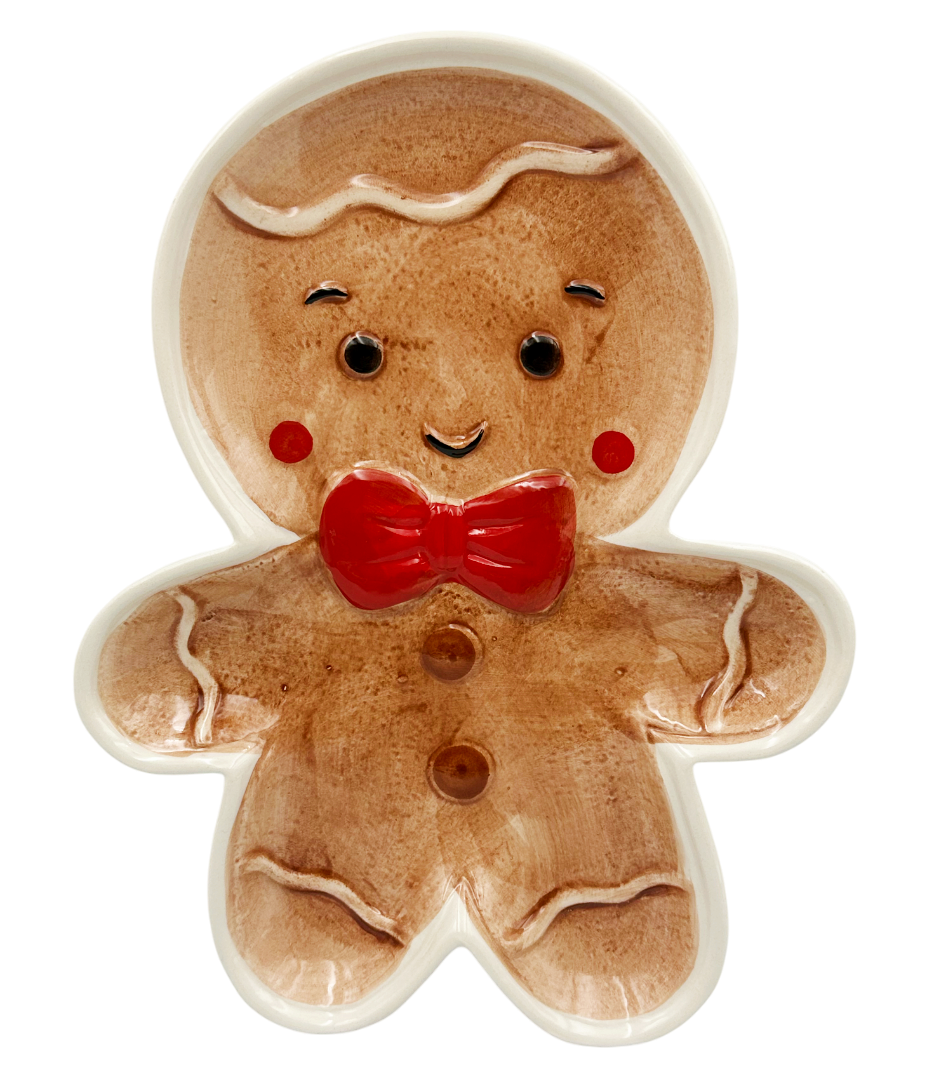 Platou ceramic adorabil în forma omulețului de turtă dulce, decorat cu detalii festive și papion roșu. Ideal pentru dulciuri, biscuiți sau servirea deserturilor de Crăciun.