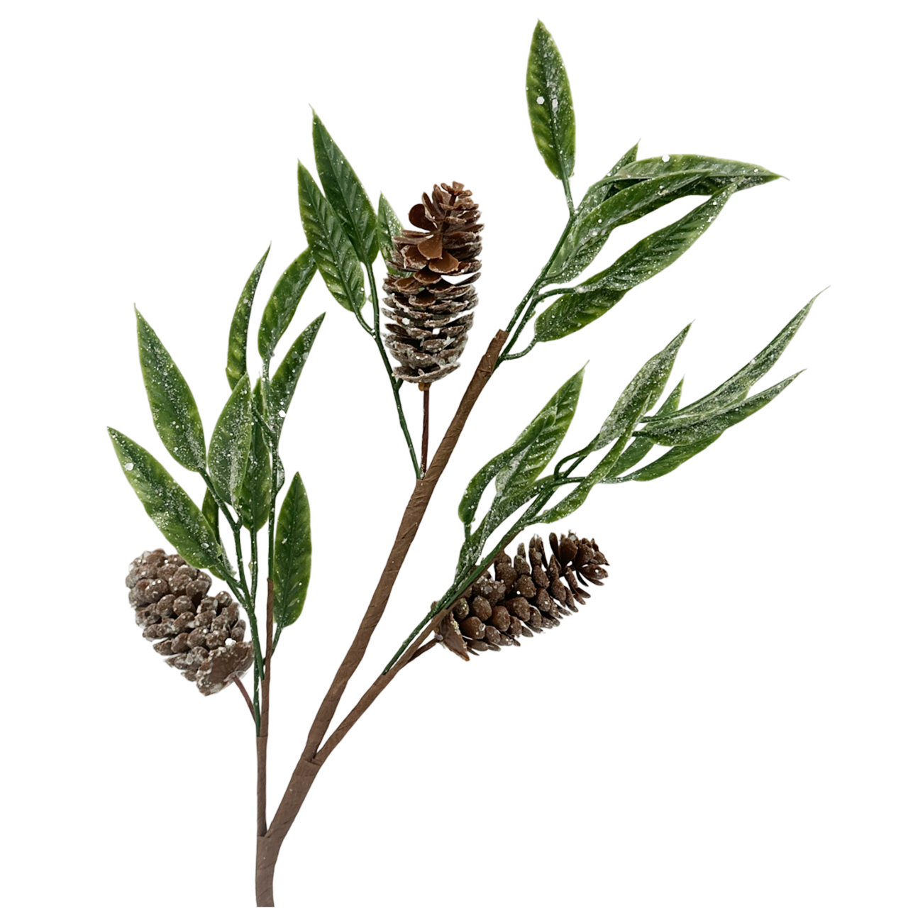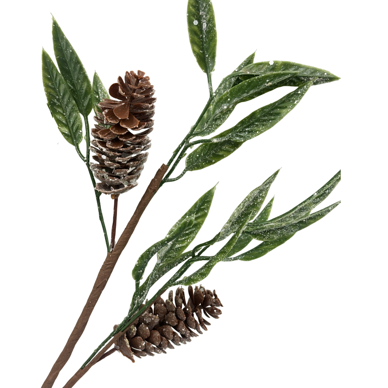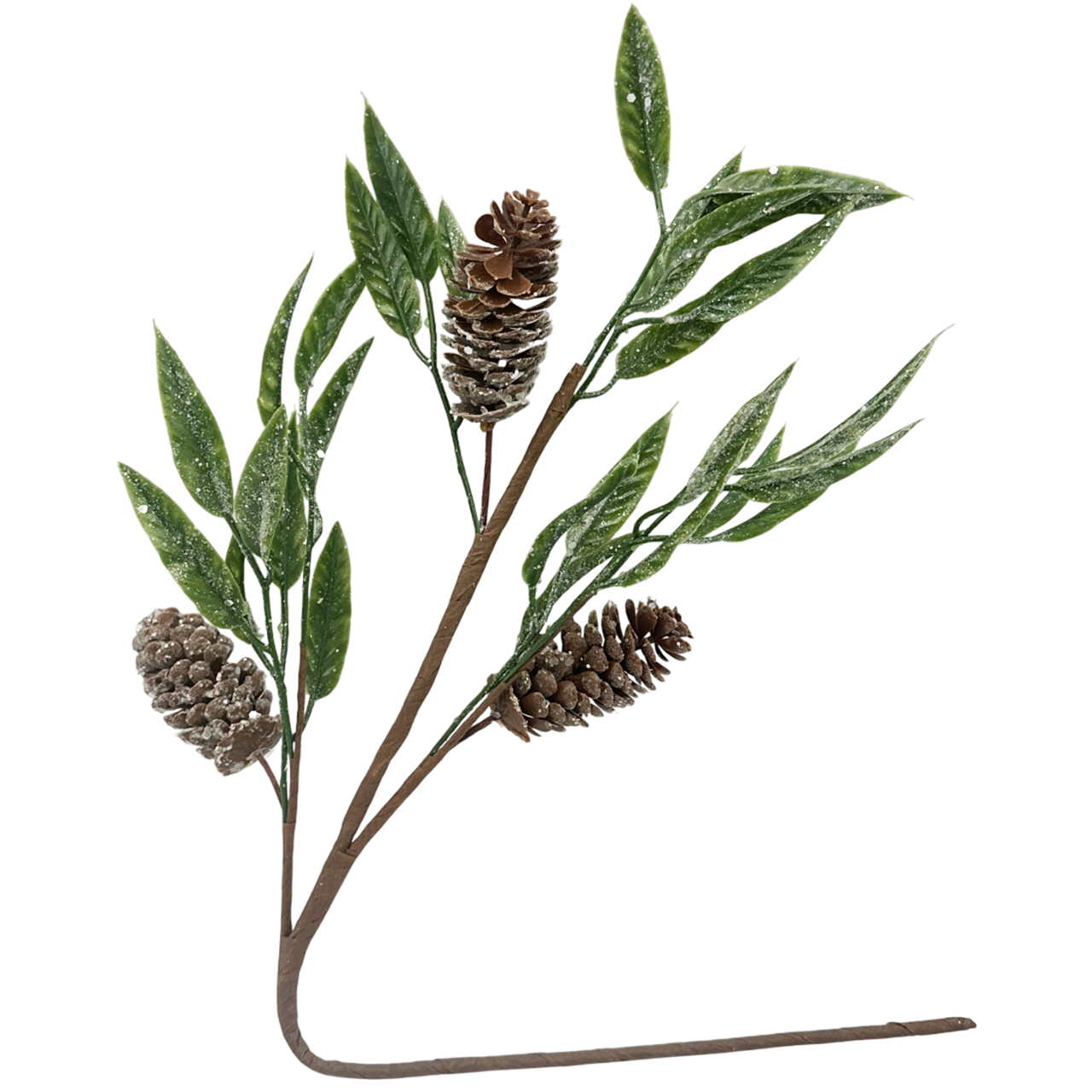 Această ramură decorativă aduce un aer natural și de iarnă oricărui decor. Conurile acoperite cu zăpadă artificială și frunzele verzi oferă un aspect elegant, perfect pentru aranjamente de Crăciun, coronițe sau decorațiuni de sezon. Ușor de integrat în orice stil, rustic sau modern.