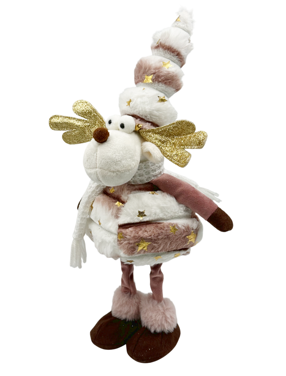 Ren decorativ din pluș moale, în nuanțe delicate de roz pudrat și alb, decorat cu stele aurii și o căciulă înaltă.