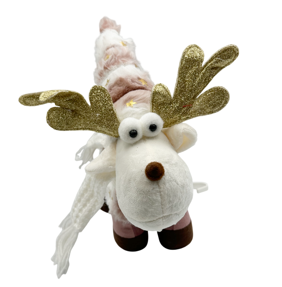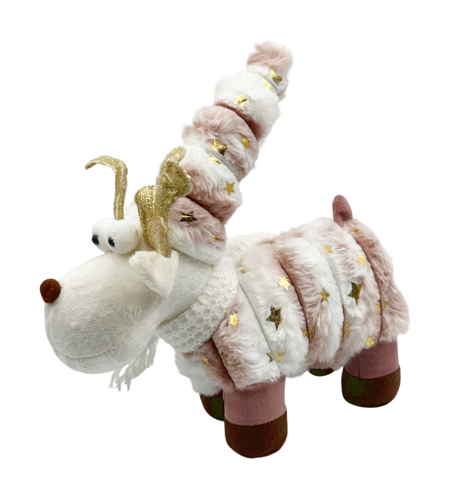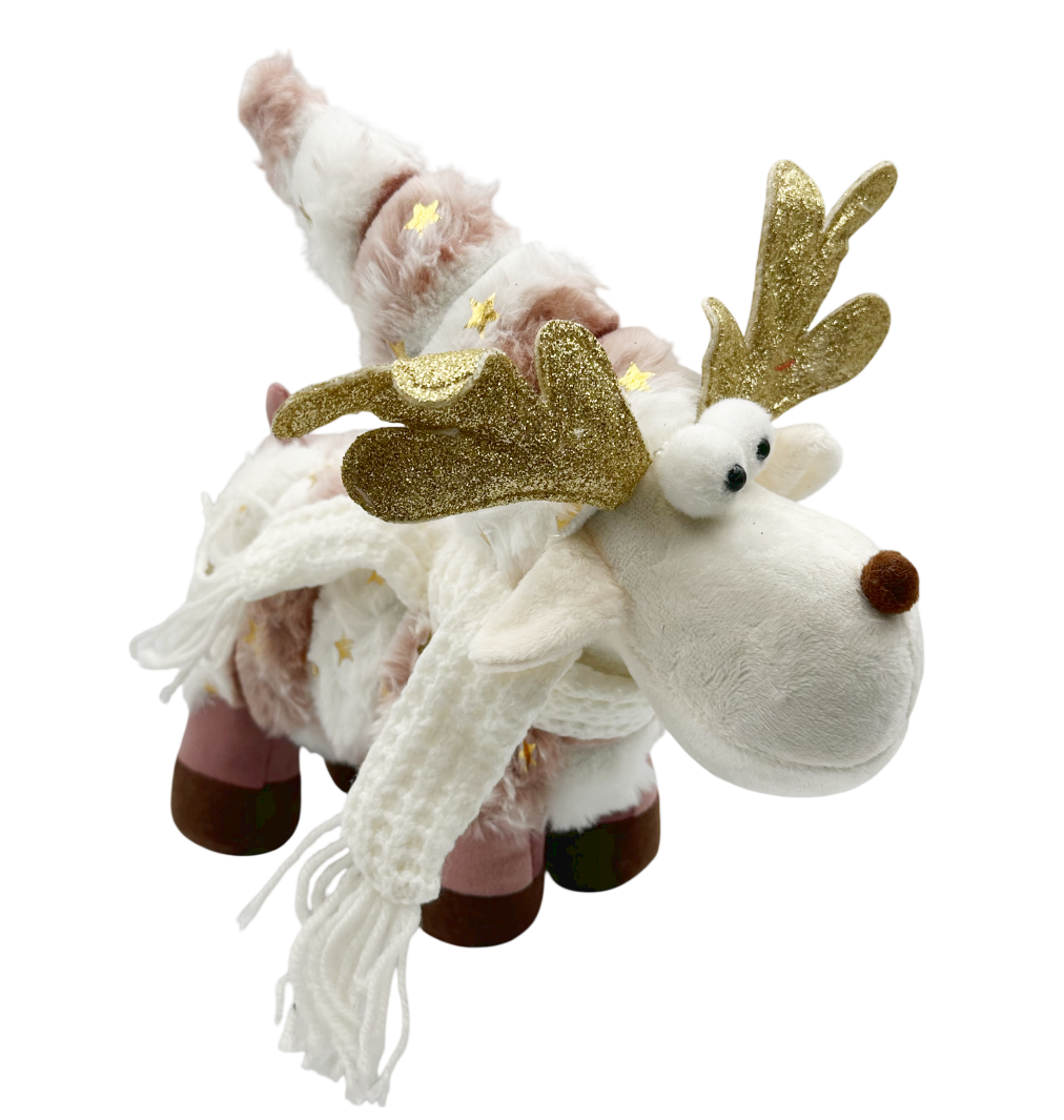 Ren decorativ din pluș moale, în nuanțe delicate de roz pudrat și alb, decorat cu stele aurii și o căciulă înaltă.