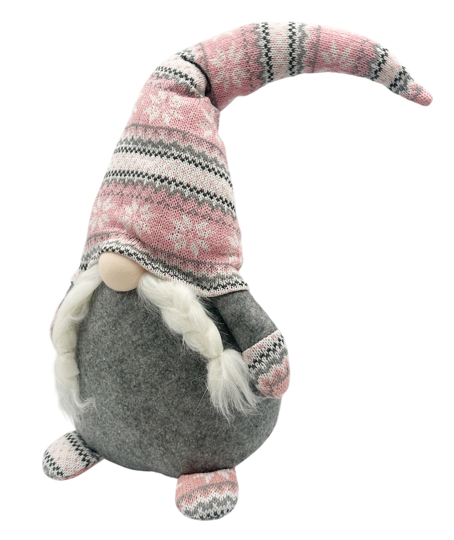 Acest spiriduș adorabil aduce zâmbete și căldură în orice colțișor al casei tale! Cu o căciulă gri-roz tricotata, codite impletite și barbă albă pufoasă, este decorul perfect pentru sărbători pline de farmec și voie bună.