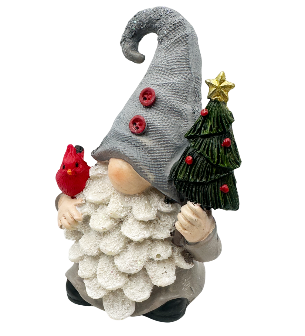 Acest simpatic spiriduș de Crăciun cu caciulita gri și barba albă stufoasă este gata să-ți ureze „bun venit” în spiritul sărbătorilor! Ține în mână un bradut și o mică pasăre roșie, detalii care adaugă farmec și căldură fiecărui decor.