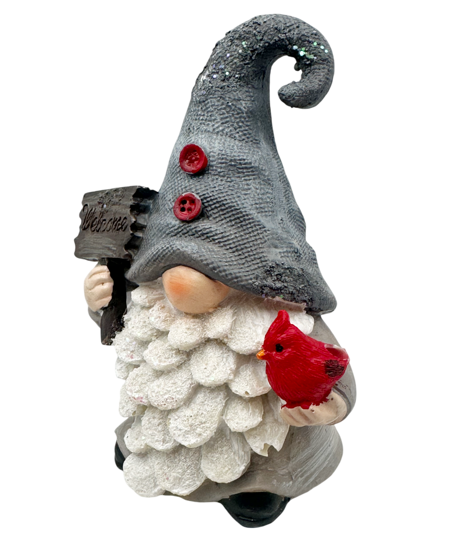 Acest simpatic spiriduș de Crăciun cu caciulita gri și barba albă stufoasă este gata să-ți ureze „bun venit” în spiritul sărbătorilor! Ține în mână o tăbliță pe care scrie Welcome și o mică pasăre roșie, detalii care adaugă farmec și căldură fiecărui decor.