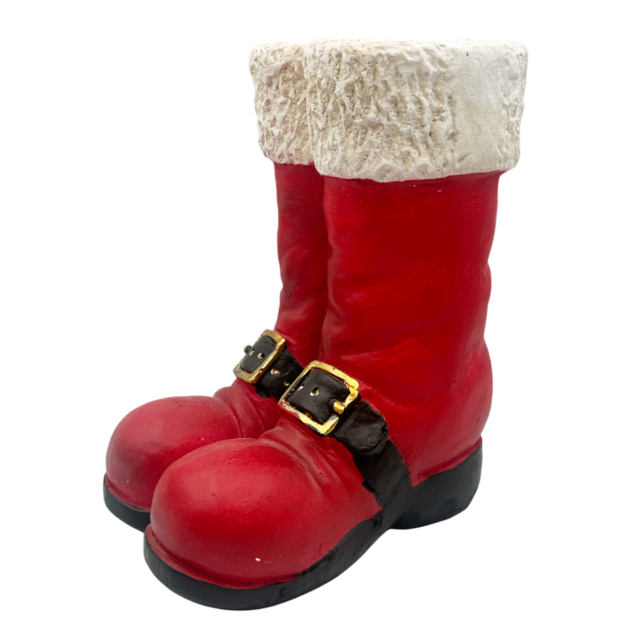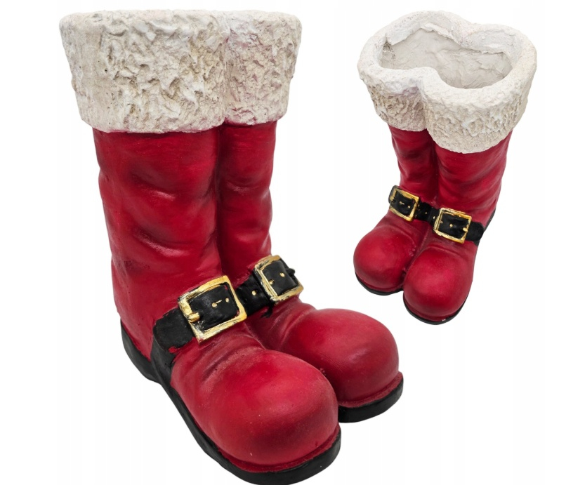 Vază ceramică în formă de cizme roșii ale lui Moș Crăciun, cu detalii aurii și textură de blăniță.