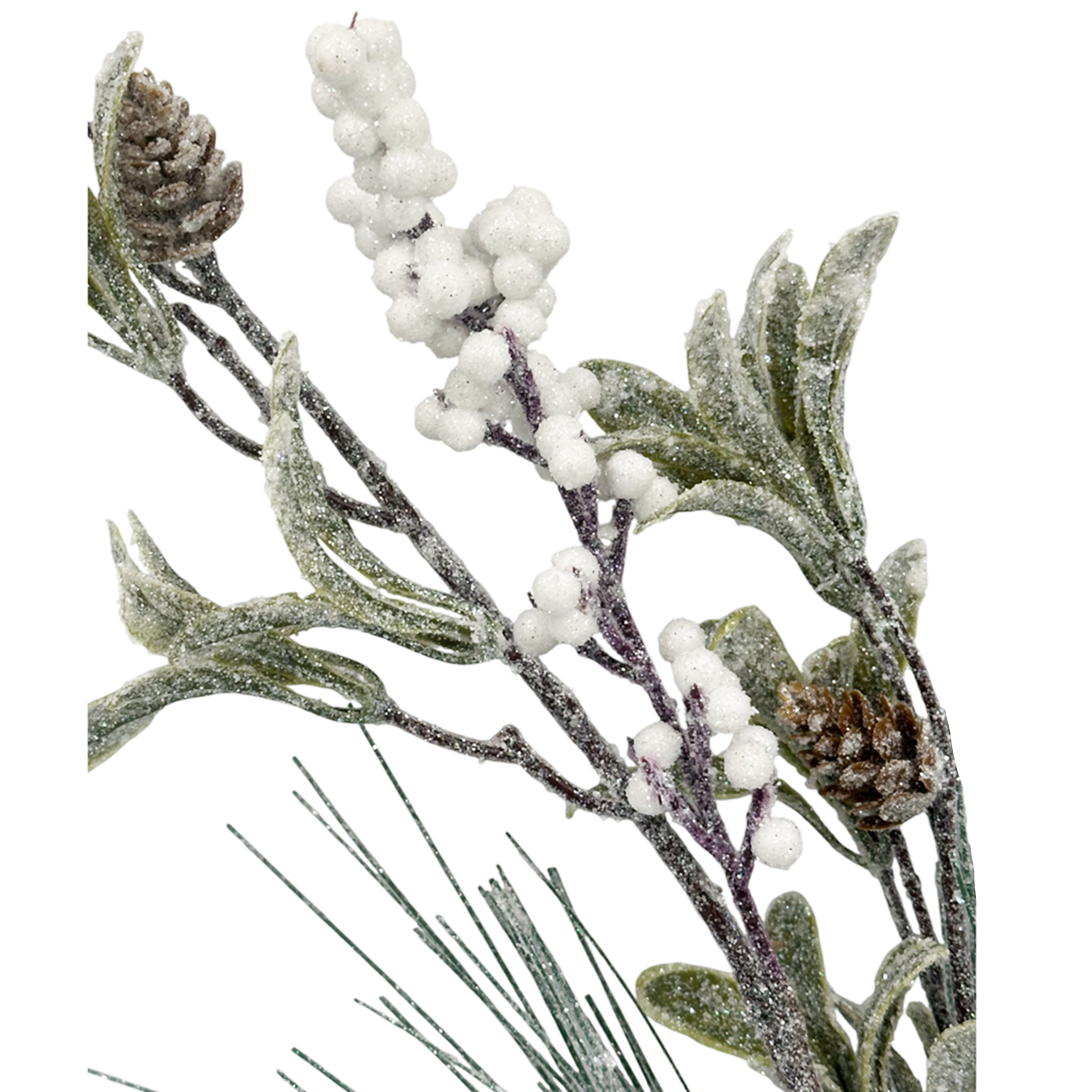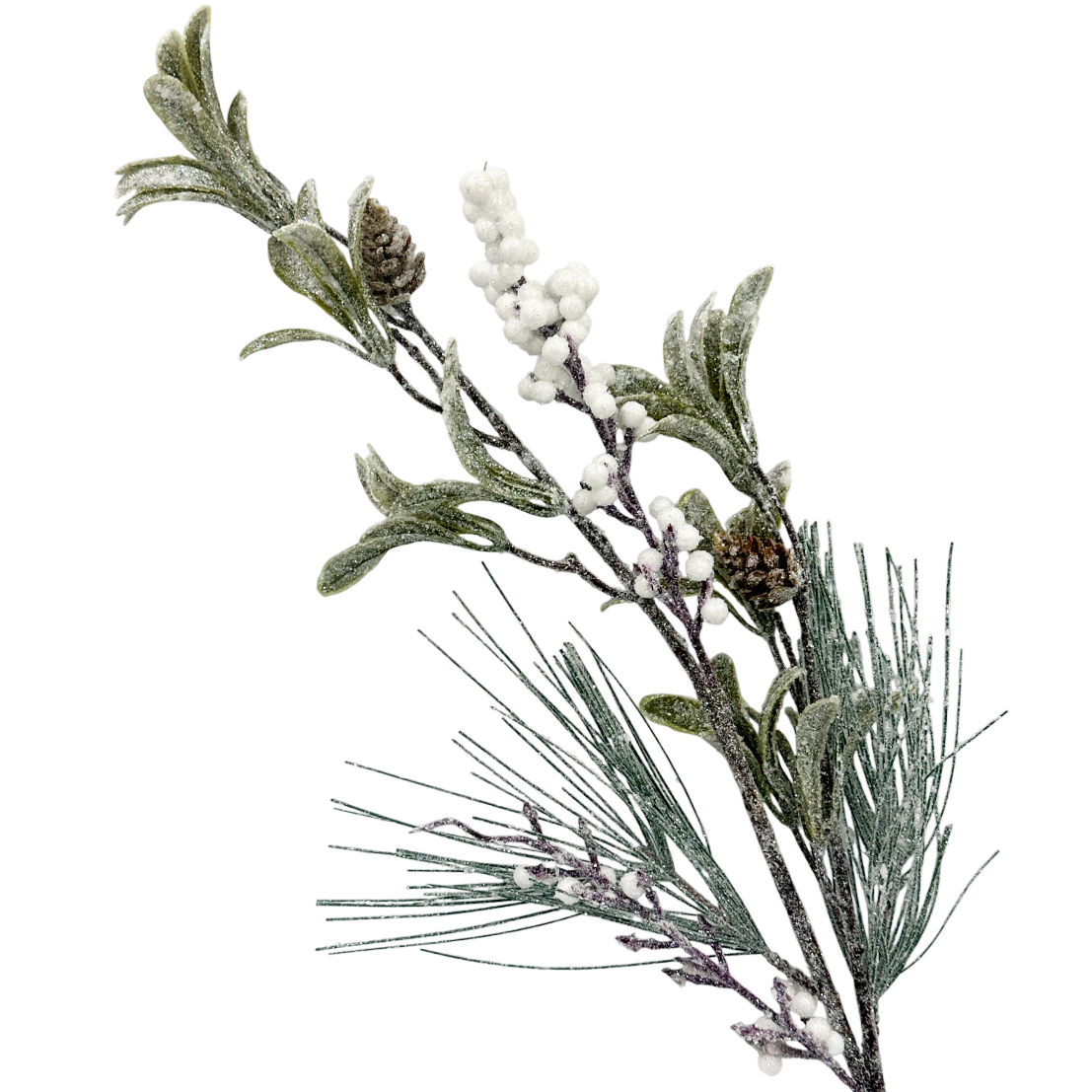 Ramură decorativă de iarnă cu flori fine, ace verzi, con de brad și strat de zăpadă artificială.
