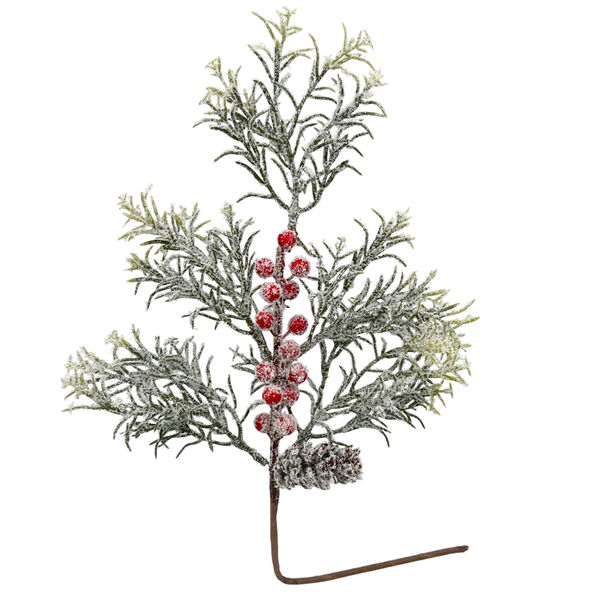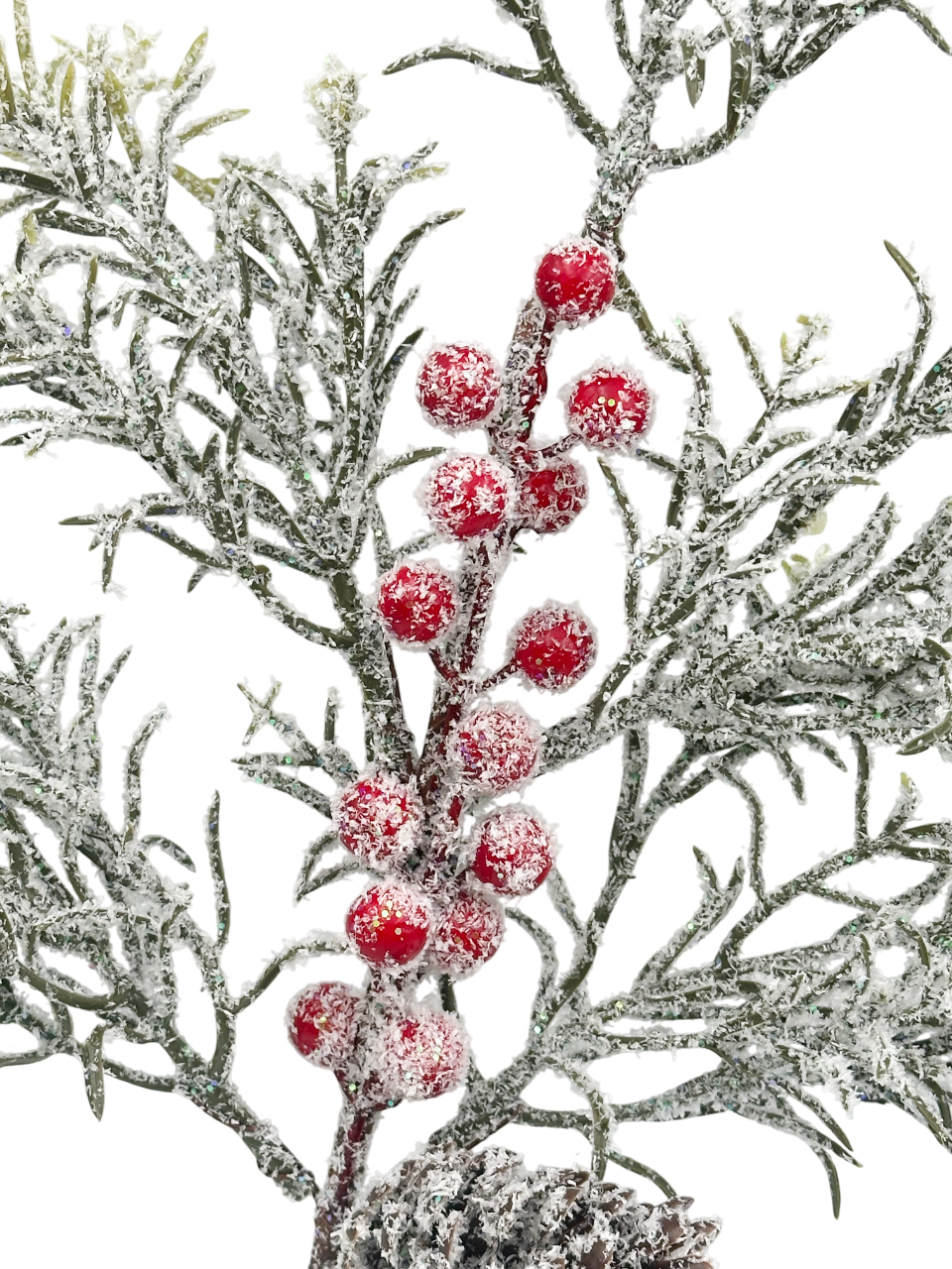 Ramură decorativă artificială cu fructe roșii și con, aspect înghețat