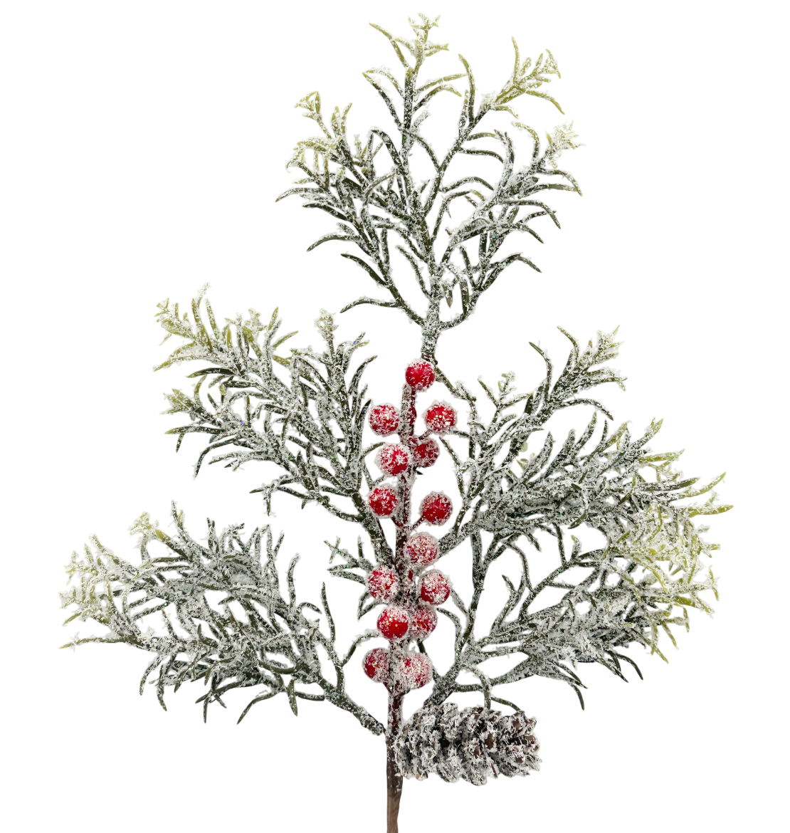 Ramură artificială decorativă, realizată din materiale de calitate, cu detalii fine și aspect natural. Frunzele verzi acoperite cu un strat de „zăpadă” artificială, fructele roșii lucioase și conul decorativ creează un efect autentic de iarnă.