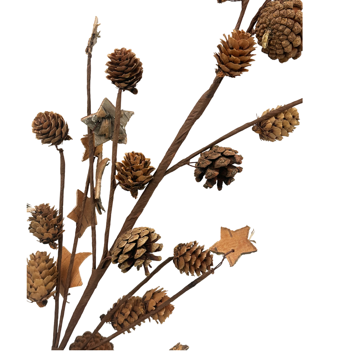 Ramură decorativă cu un design natural, realizată din conuri mici și stele din lemn, perfectă pentru aranjamente de iarnă sau decoruri rustice.