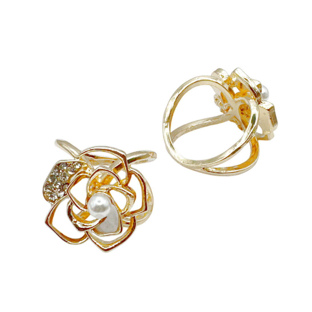 Inel de eșarfă elegant în formă de floare BELLA, realizat din metal argintiu, decorat cu sidef, strasuri si o perla centrala rafinata.
