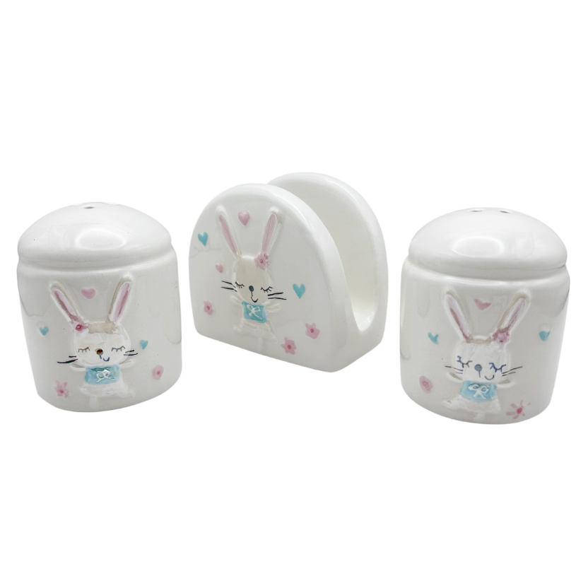 Completează masa de Paște cu acest set decorativ adorabil, format din suport pentru șervețele și solniță/piper, decorate cu iepurași simpatici. Designul în nuanțe pastel, cu detalii delicate și motive jucăușe, aduce un plus de veselie și eleganță mesei festive.