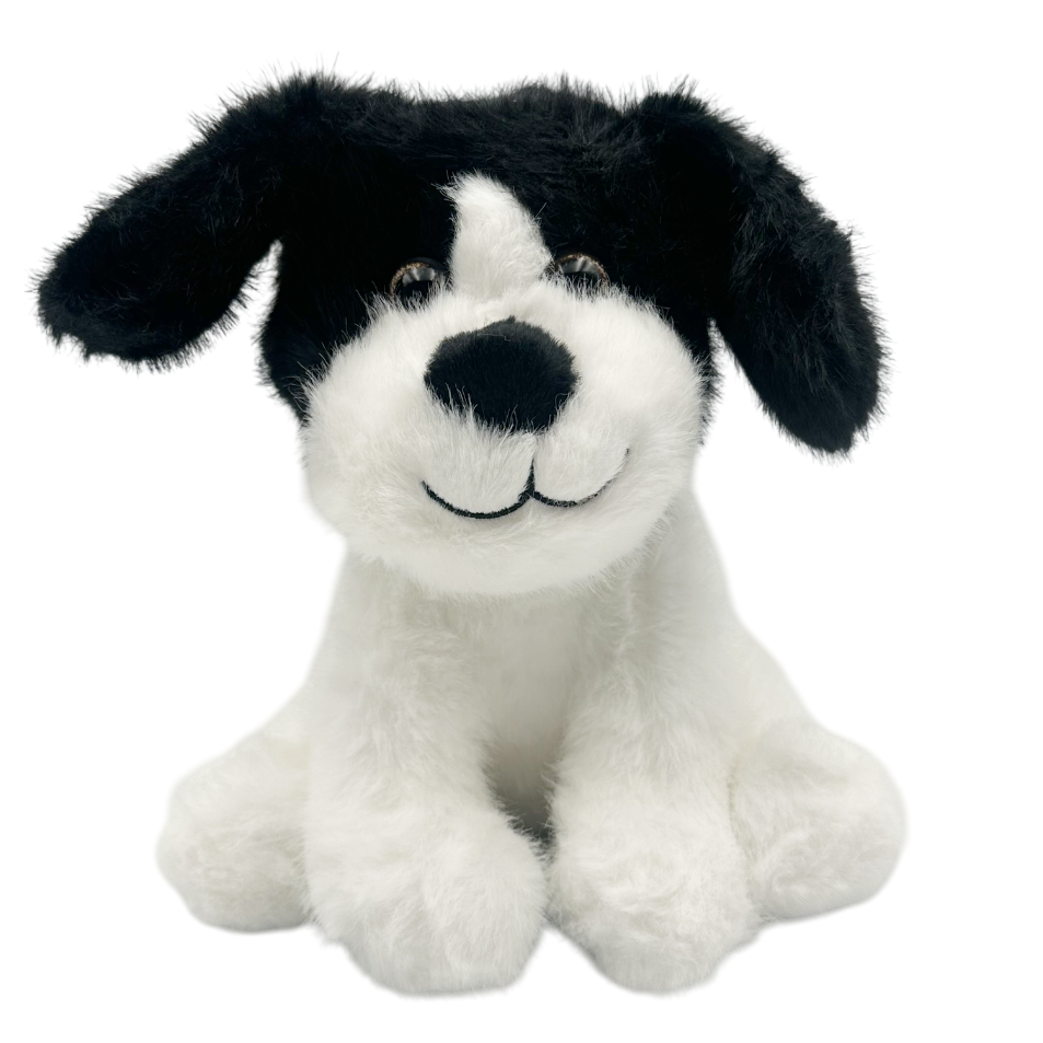 Acest adorabil cățeluș de pluș alb-negru este moale, pufos și perfect pentru îmbrățișat.