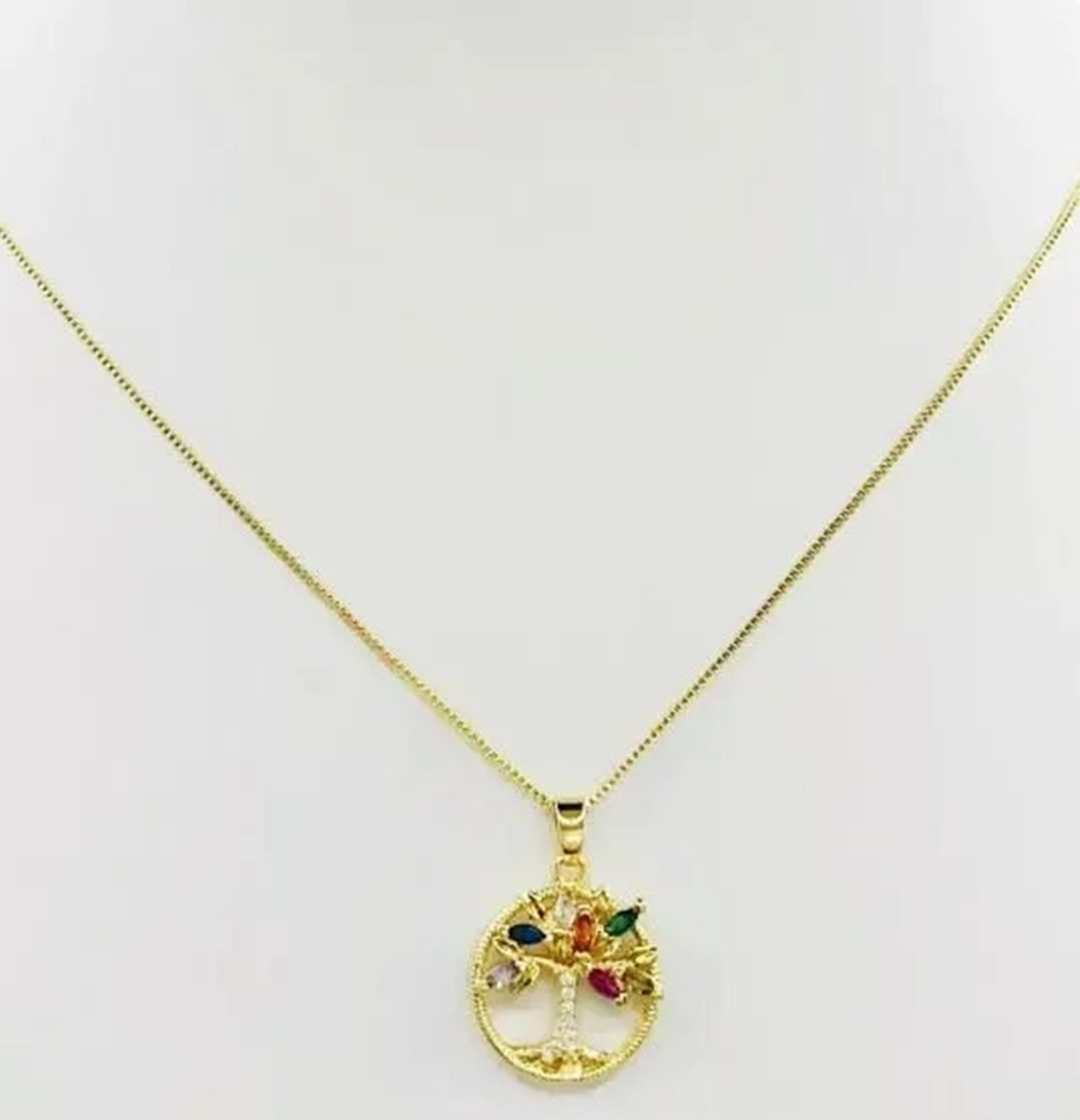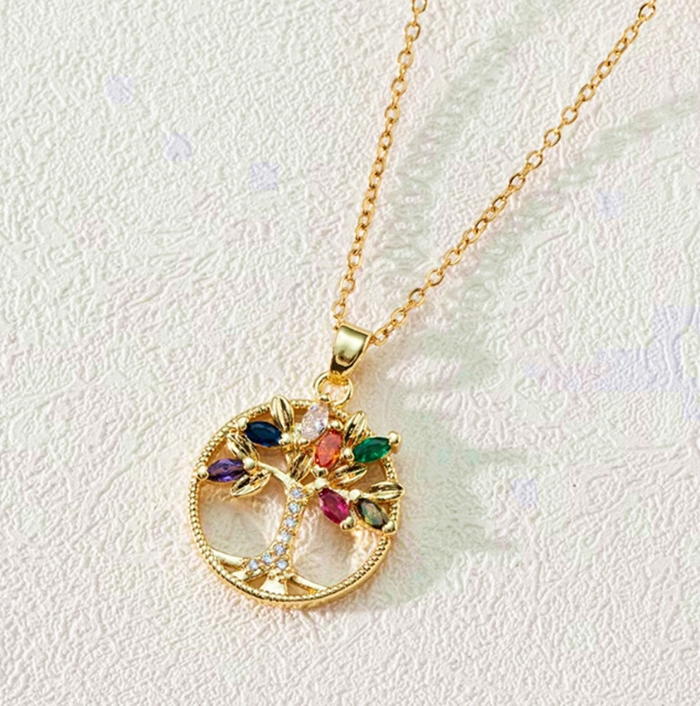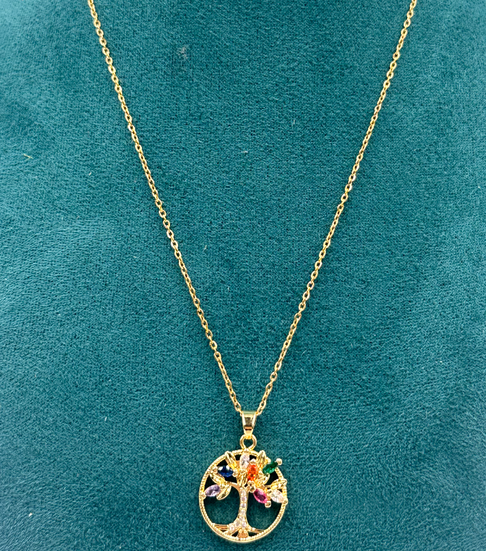 Colier auriu cu pandantiv Copacul Vieții decorat cu zirconii multicolore.