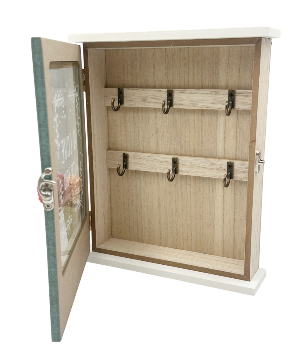 În interior, cutia dispune de 6 agățători metalice, ideale pentru chei, brelocuri sau accesorii mici. Nu este doar utilă, ci și o modalitate elegantă de a adăuga personalitate locuinței tale.
