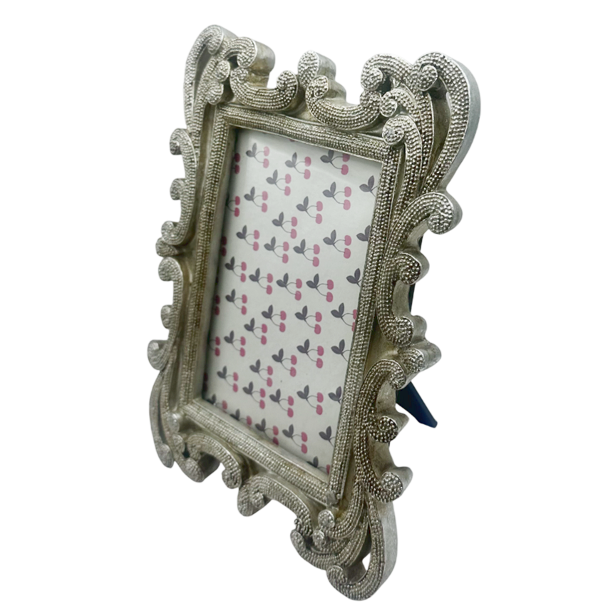 Evidențiază amintirile tale speciale cu această ramă foto elegantă, în stil vintage, finisată în nuanță argintie. Designul bogat ornamentat, cu detalii rafinate și forme decorative, oferă un aspect clasic și sofisticat, perfect pentru orice tip de interior.