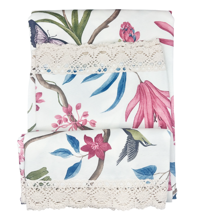 Față de masă din brocard satinat, cu imprimeu delicat cu păsări și flori