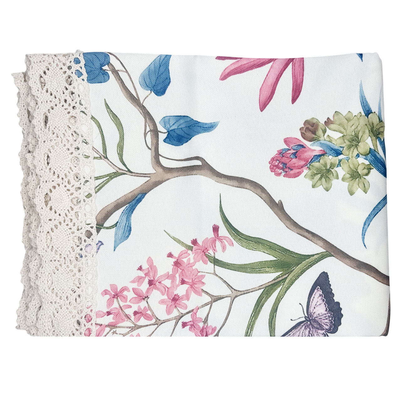 Fata de masa cu flori si fluturi GARDEN, Cu dantela, 110x150 cm