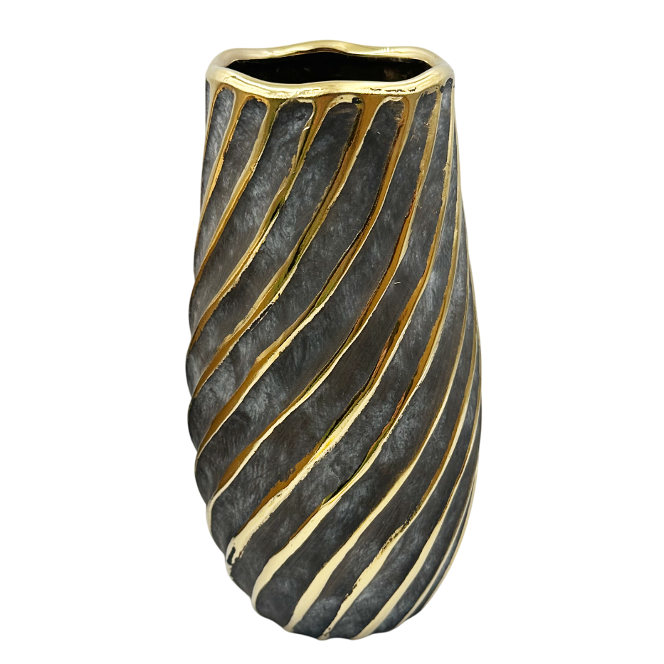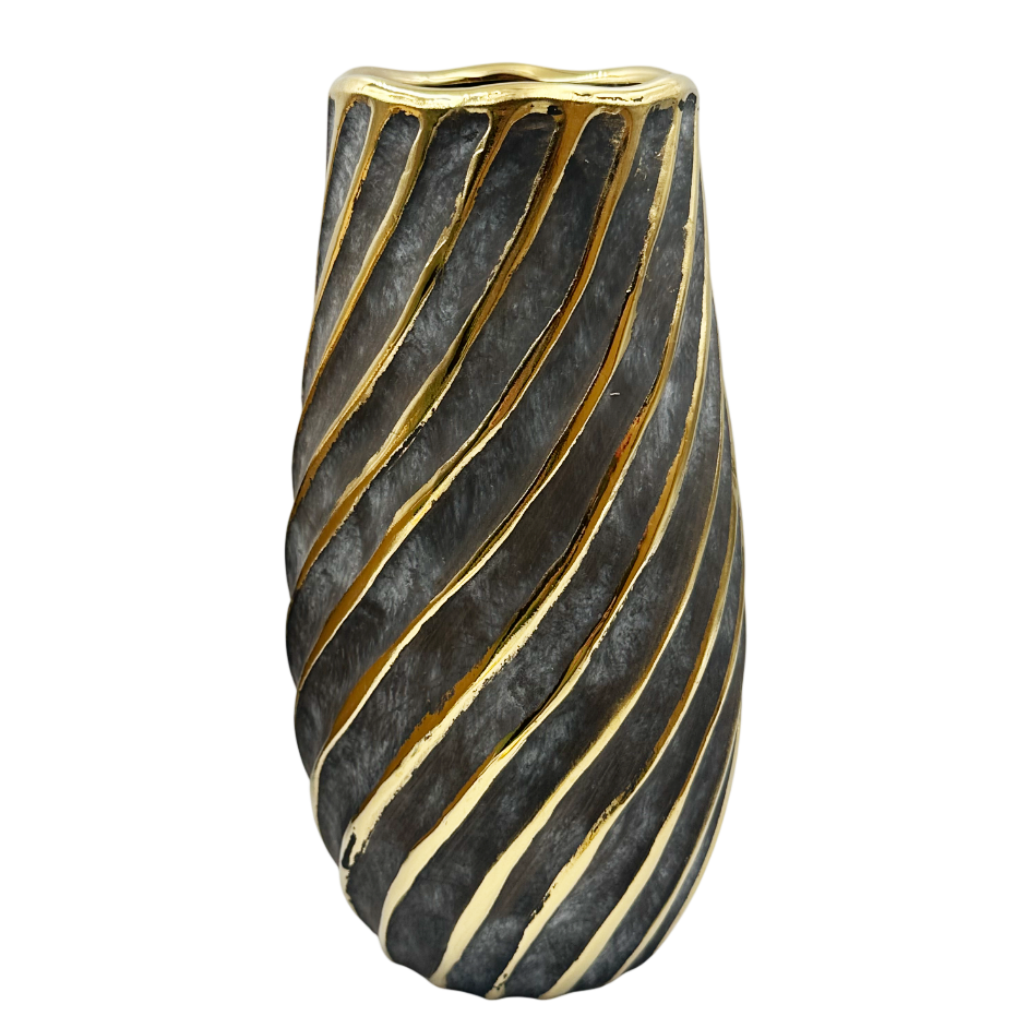 O vază decorativă modernă, realizată din ceramică, cu un design spiral elegant. Nuanța închisă, asemănătoare griului grafit, este pusă în valoare de liniile aurii lucioase care creează un contrast sofisticat.