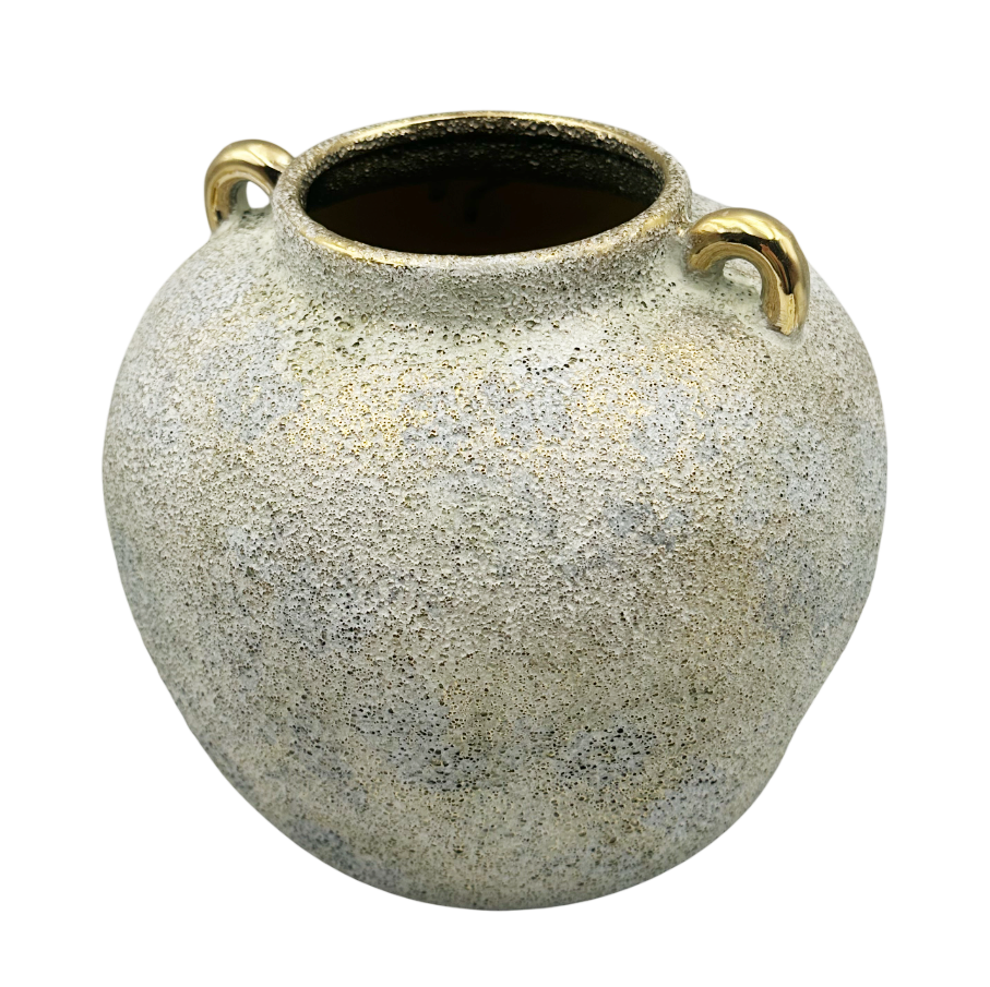 Vază decorativă cu textură rustică și reflexe aurii, completată de două mânere metalizate aurii.