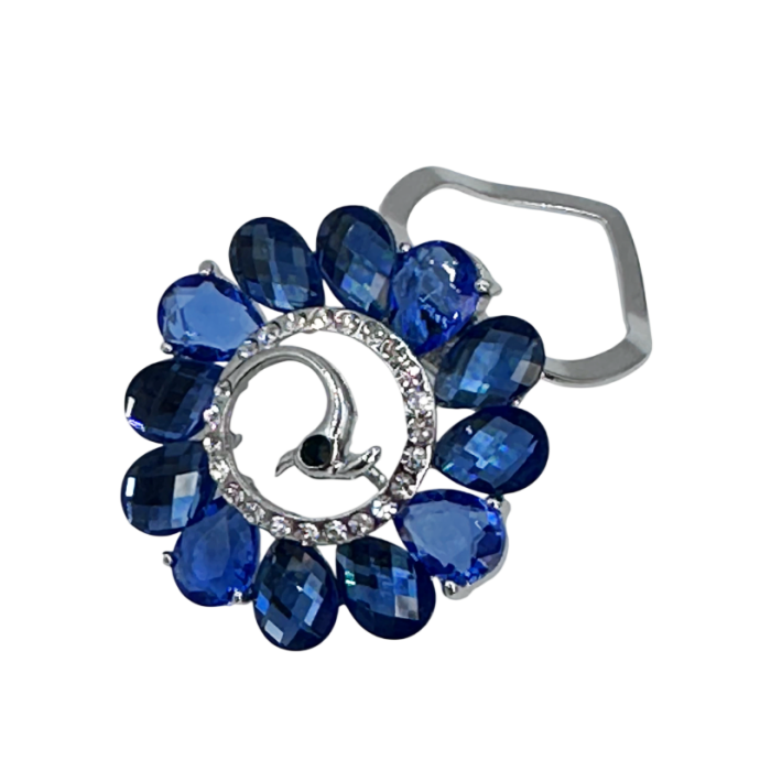Adaugă un plus de eleganță și rafinament ținutelor tale cu acest inel pentru eșarfă decorat cu cristale albastre intense. Designul floral, cu pietre fațetate în nuanțe vibrante de albastru și detalii strălucitoare, transformă orice eșarfă simplă într-un accesoriu sofisticat.