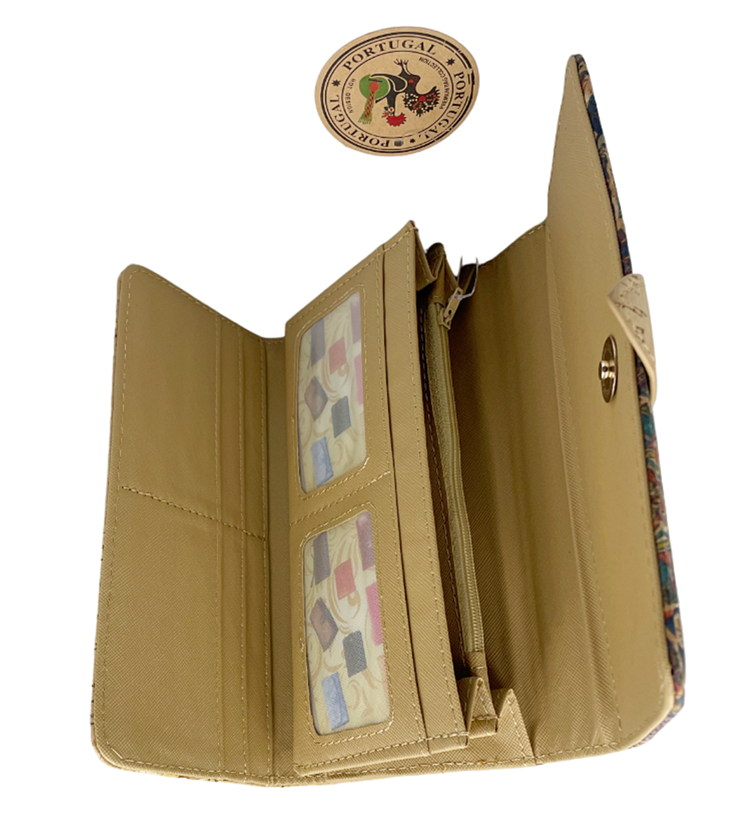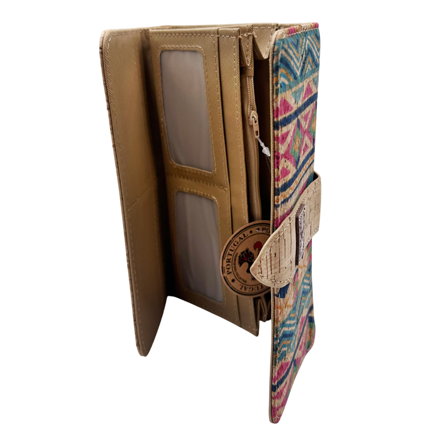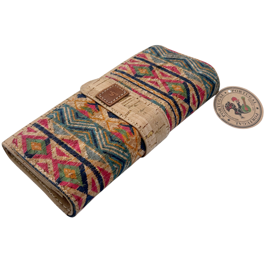 Portofel damă realizat din plută, cu imprimeu etnic multicolor( pe o singura fata) și design elegant.