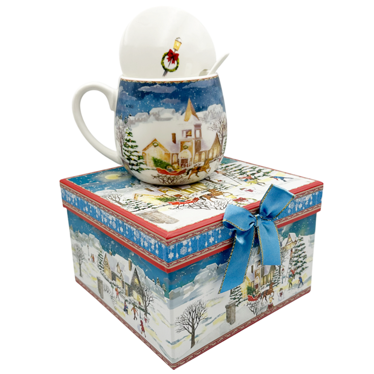Transformă fiecare pauză de ceai sau cafea într-un moment magic cu aceasta Cana cu capac si lingurita, decorata cu un superb peisaj de iarnă: case luminate, oameni veseli, sanie cu cai și atmosfera caldă de sărbători.