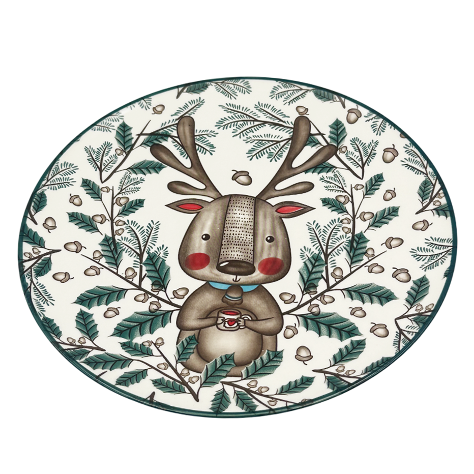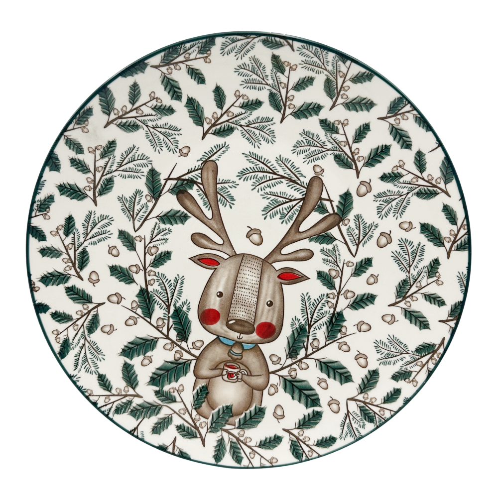 Adaugă un strop de eleganță și veselie mesei de Crăciun cu acest platou ceramic decorat cu un ren stilizat și motive naturale de iarnă. Cu design atent pictat în nuanțe calde de bej, verde și roșu, bolul creează o atmosferă cozy și rafinată.
