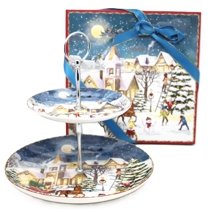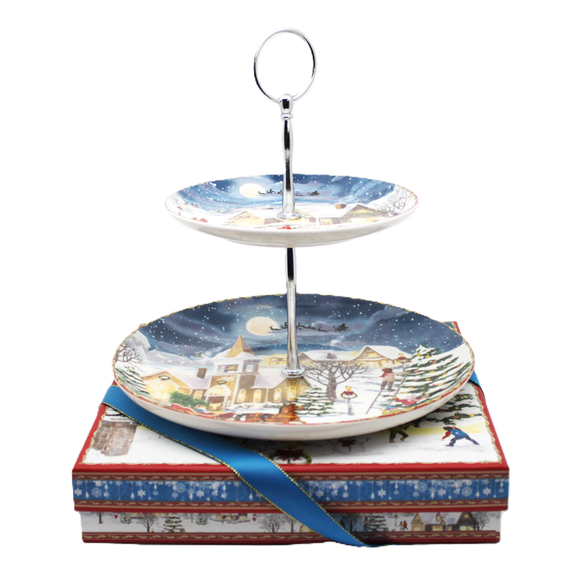 Adaugă farmecul sărbătorilor în casa ta cu această etajeră din porțelan cu 2 nivele, decorată cu un superb peisaj de iarnă: căsuțe luminate, copii la joacă și Moș Crăciun în sanie. Realizată din porțelan fin și accesorizată cu suport metalic elegant, etajera este perfectă pentru prăjituri, biscuiți, fursecuri sau bomboane.