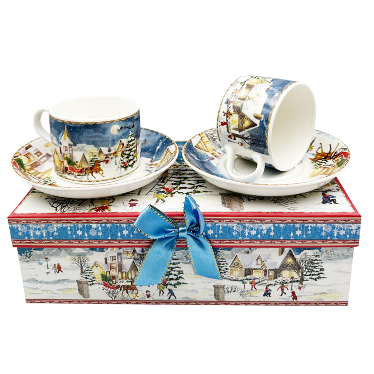 Transformă fiecare pauză de ceai sau cafea într-un moment magic cu acest set elegant de 2 căni din porțelan, decorate cu un superb peisaj de iarnă: case luminate, oameni veseli, sanie cu cai și atmosfera caldă de sărbători. Fiecare cană este prevăzută cu linguriță asortată, iar întregul set vine ambalat într-o cutie cadou premium, cu ilustrații detaliate și o fundă satinată.