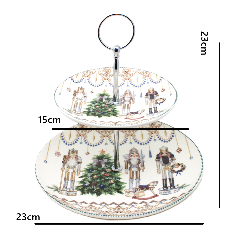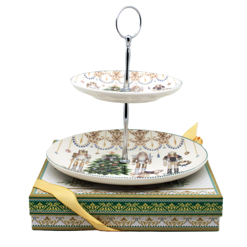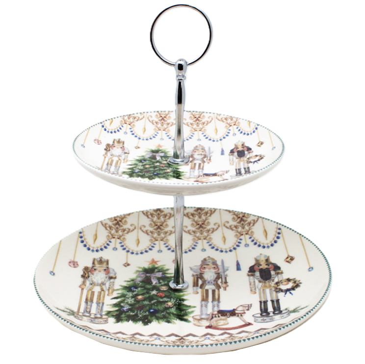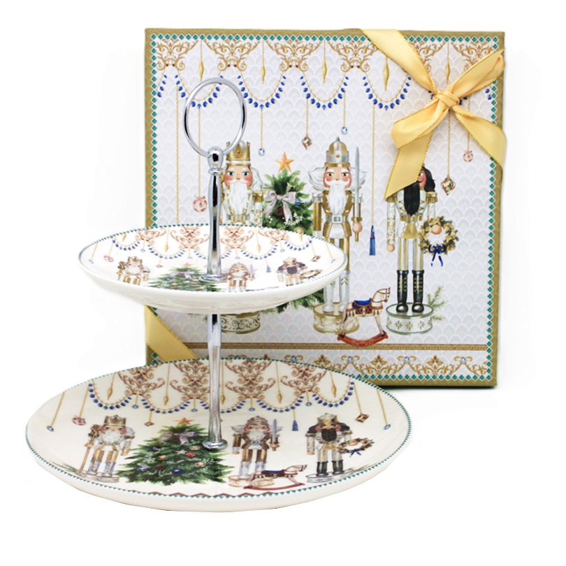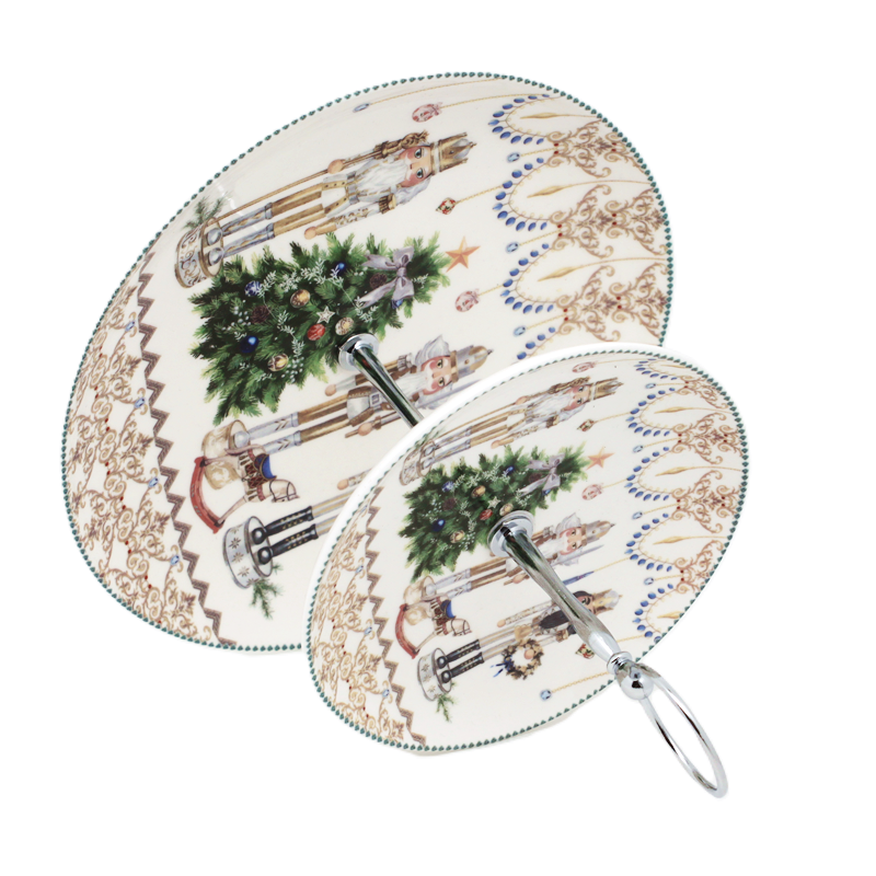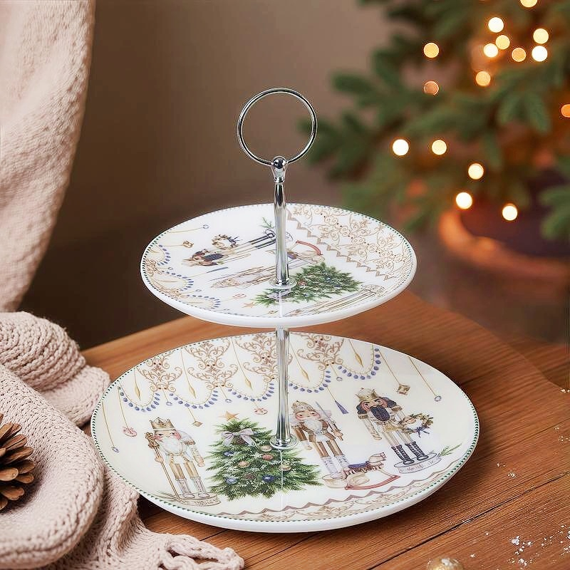 Transformă-ți masa de sărbătoare într-un colț de poveste cu acest platou pentru prăjituri din ceramică, cu două niveluri și un decor festiv inspirat din clasicul Spărgătorul de Nuci.